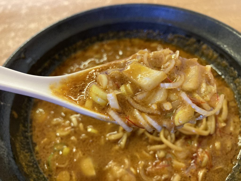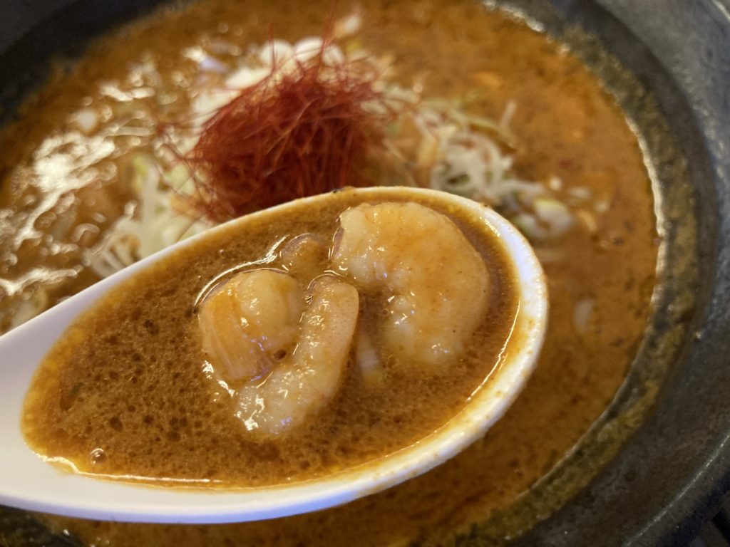 スープは海老のだしが効いていてコクがあり。あっさり系のみそとだしのハーモニーがたまりません。