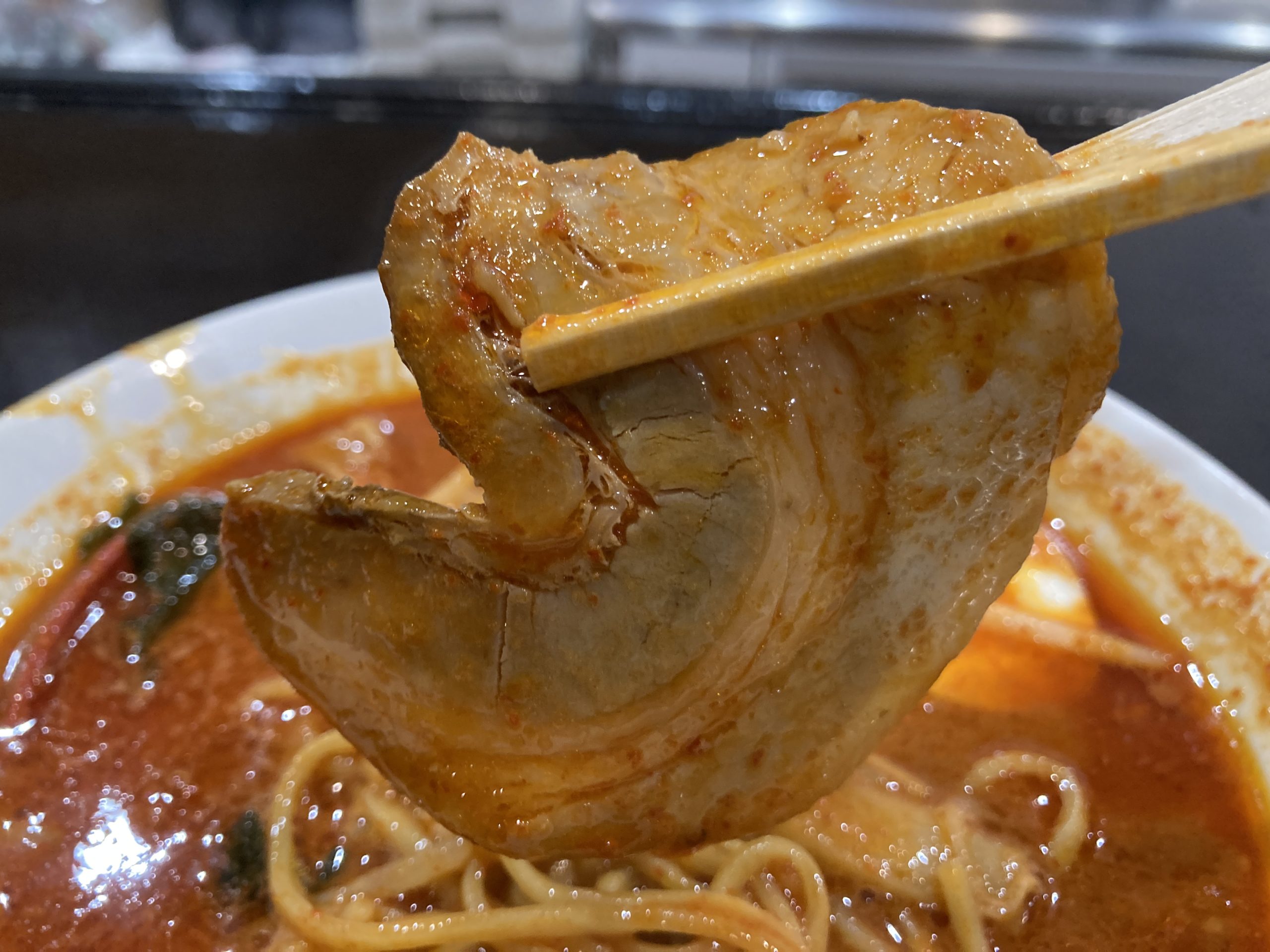 食べ進めていくと口の周りが痛くなるほどの辛さ、さすが死神!キャロライナリーパーを使用しているのに、スープの美味しさを感じられるところが素敵なわけです。辛くて痛いだけのラーメンじゃない。