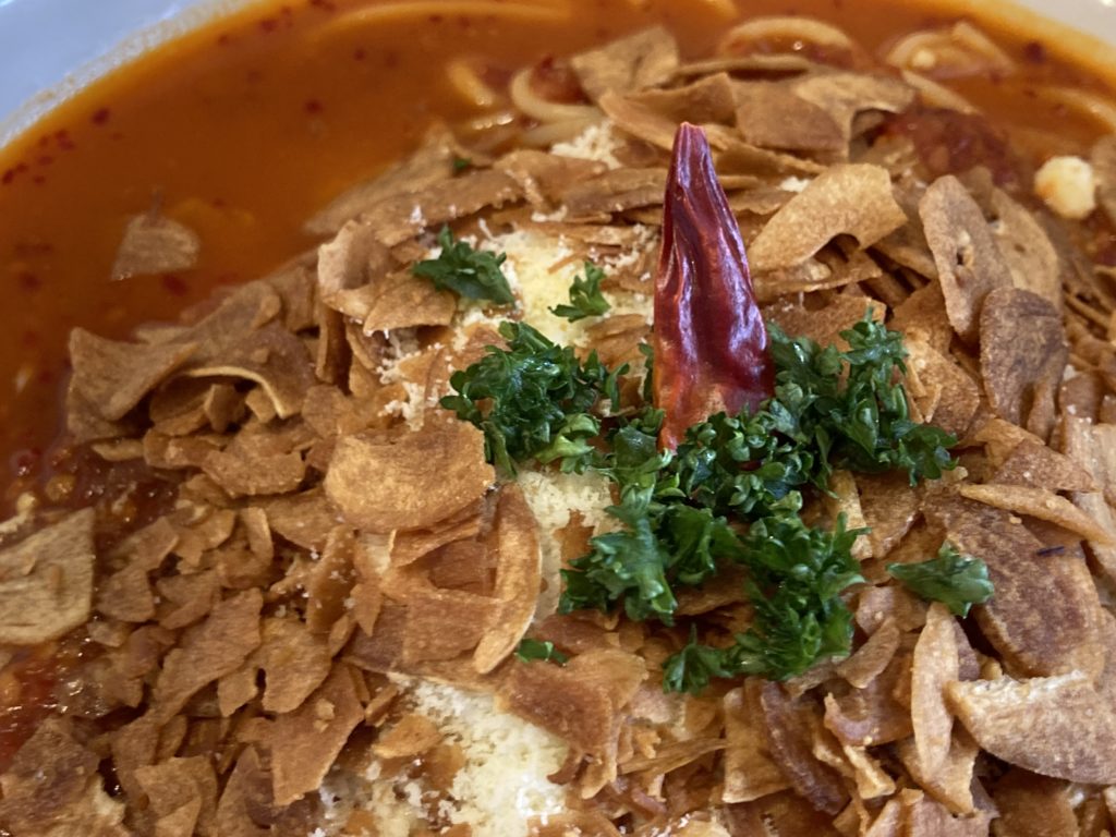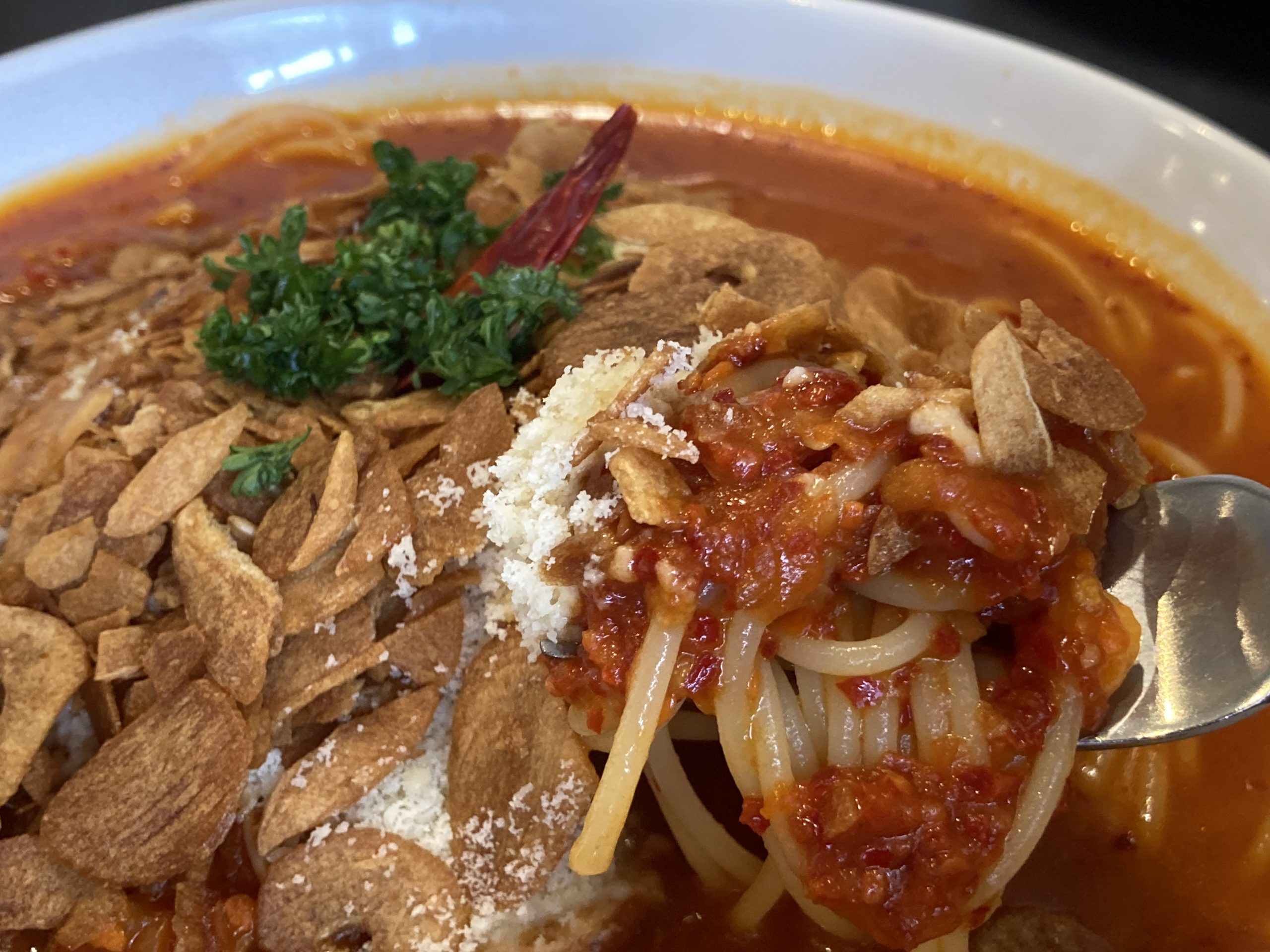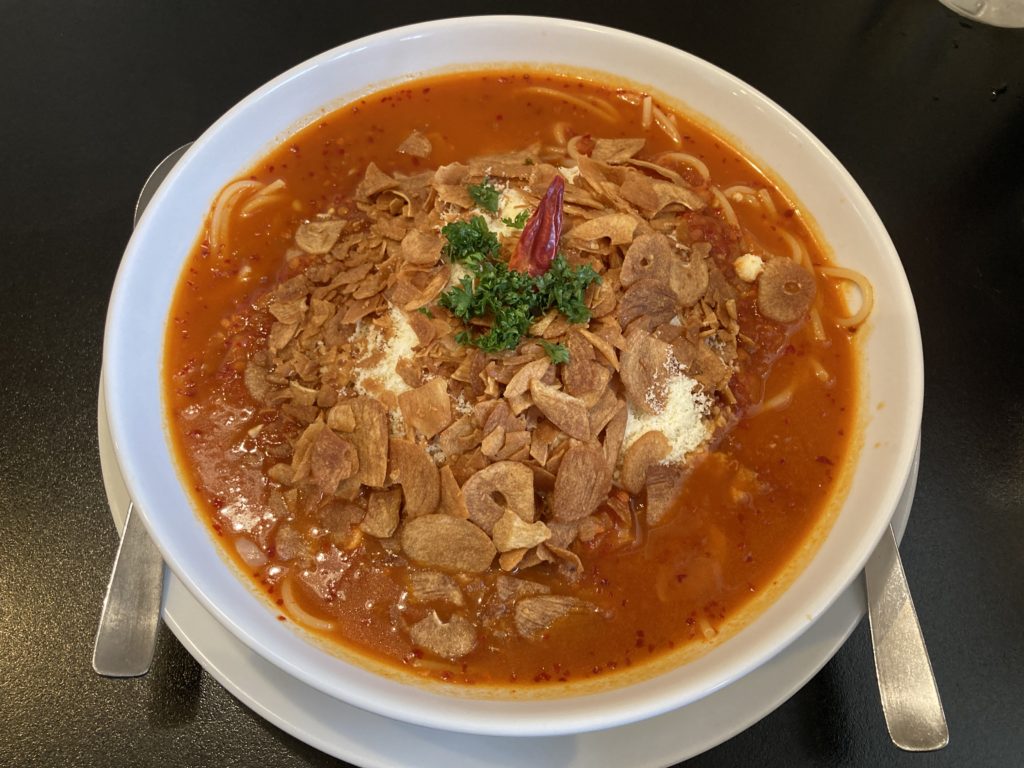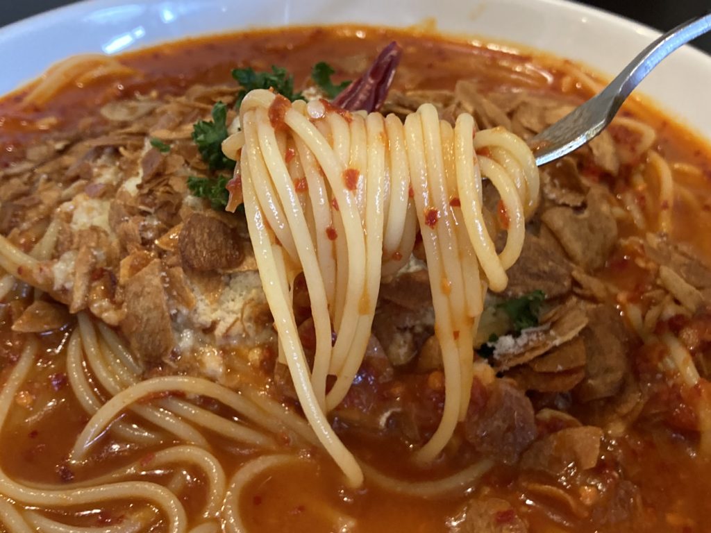 ちなみにこちらは赤唐辛子とにんにくトマトソース(辛さノーマル)さらさらのスープに麺とチーズが絡んで絶品ですよ。