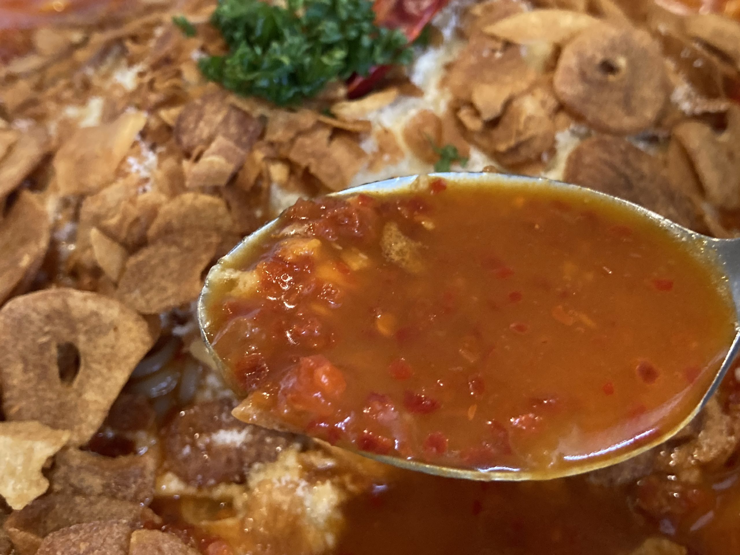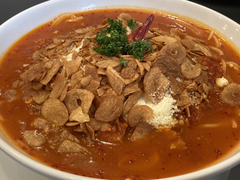 その赤さもさることながら・・・ニンニクの多さに驚きです。こんなにもたくさんの揚げニンニクを今まで食べたことがあったでしょうか(笑)