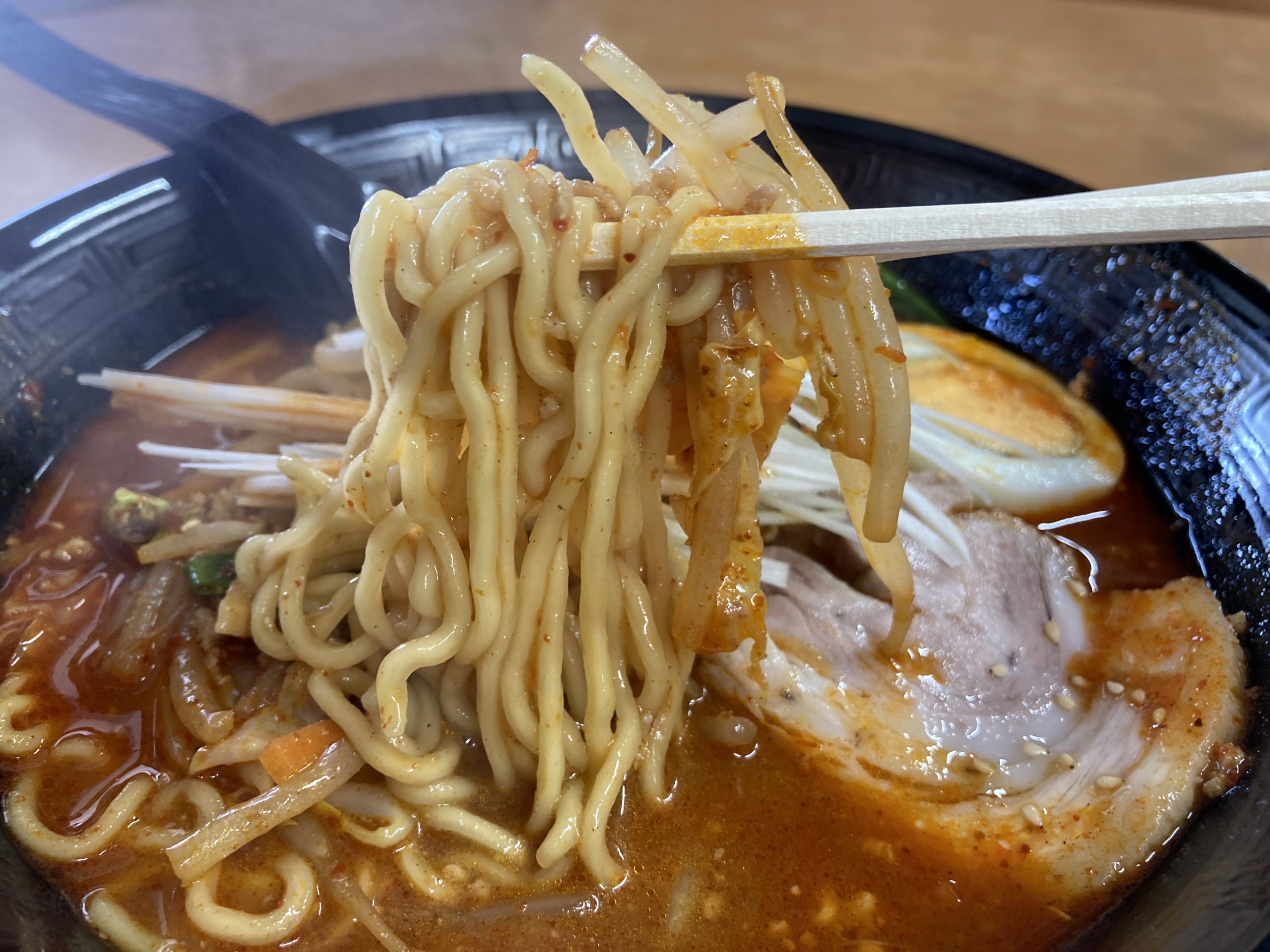 味噌ベースの濃厚激辛スープが中細麺に絡んで美味~。