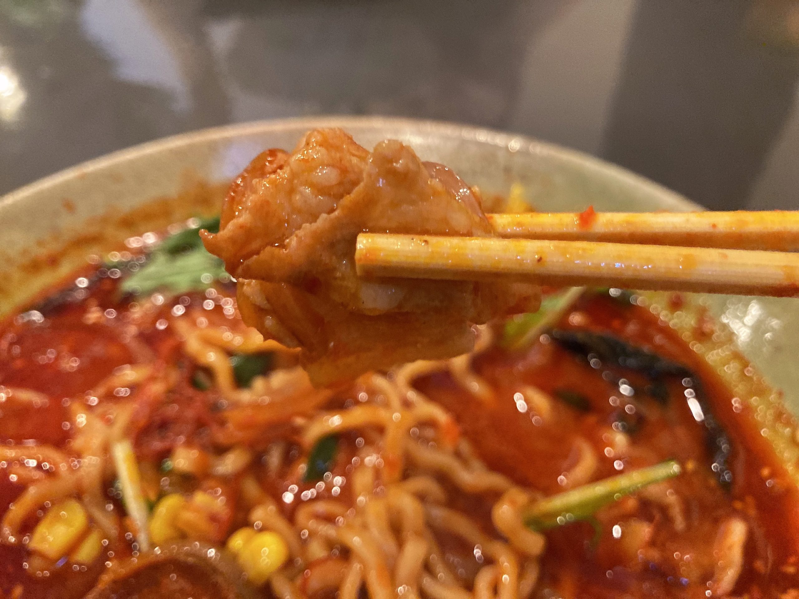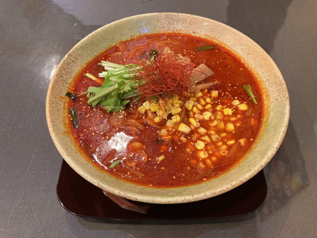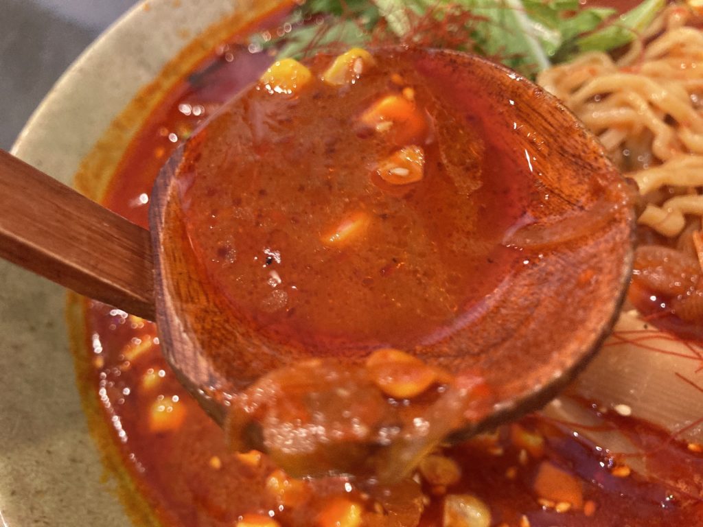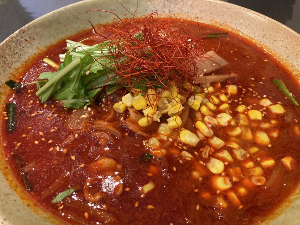 地獄という名前の通り血の池のように唐辛子で真っ赤なスープは食欲をそそるビジュアル。味噌ベースのスープは程よくニンニクが効いていて濃厚、まろやかな辛さが攻めてきます。