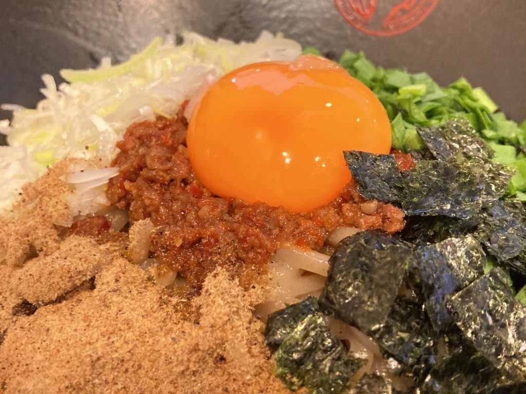 麺の上に2種類のネギ、のり、肉味噌、そして生卵がトッピングされています。しっかり混ぜ混ぜしていただきますよ〜。