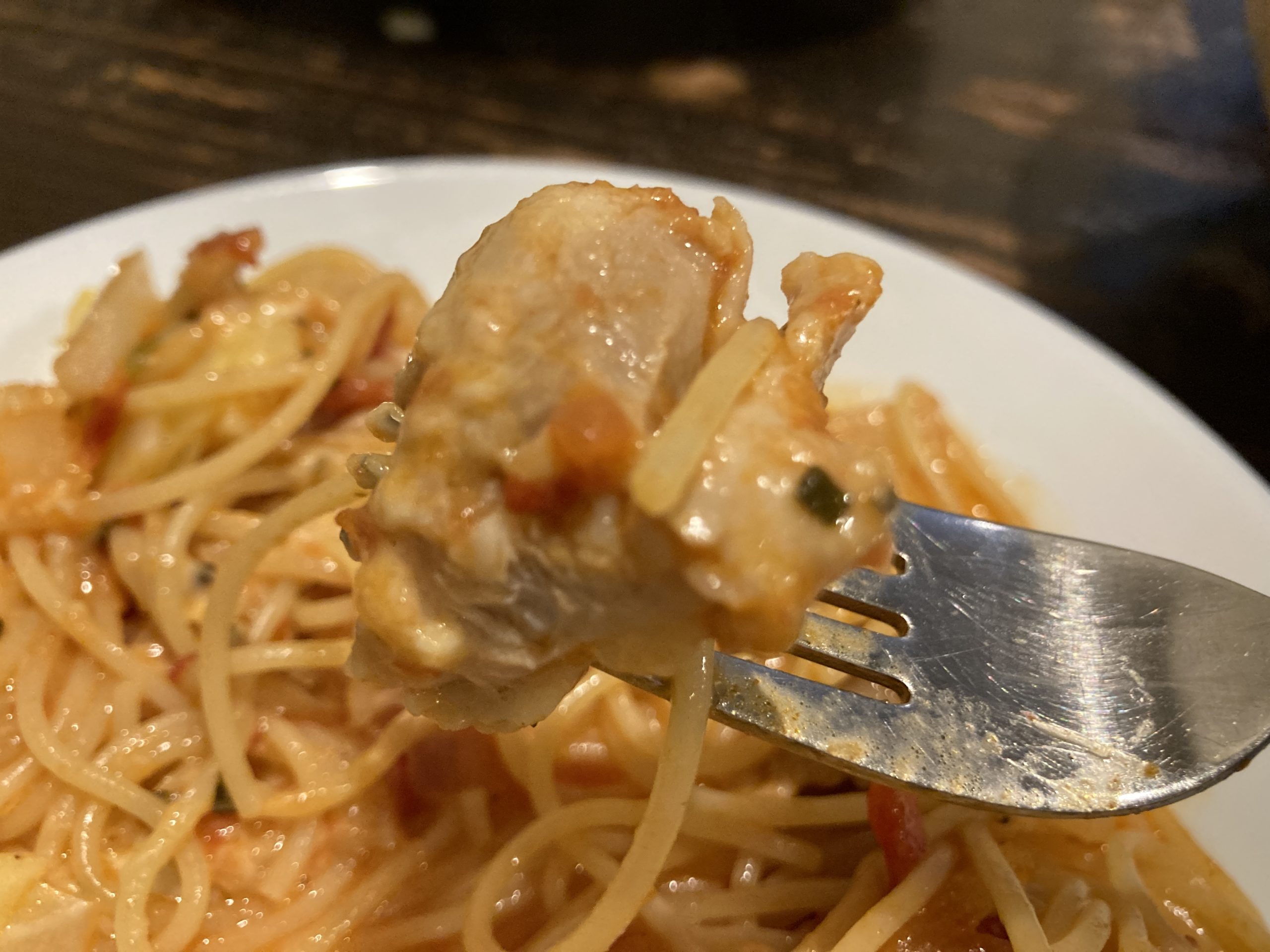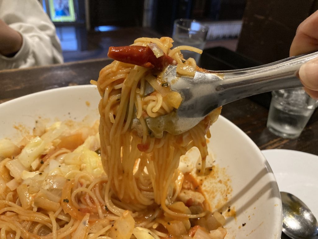 パスタは細麺なのでとても食べやすく、具材と麺そしてソースのハーモニー抜群、びっくりするほどの辛さではなくピリ辛です。