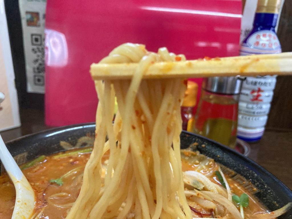 プッチーニを使ったスープは激辛。苦味はなくコクのある味噌スープが麺に絡み橋が止まりません。