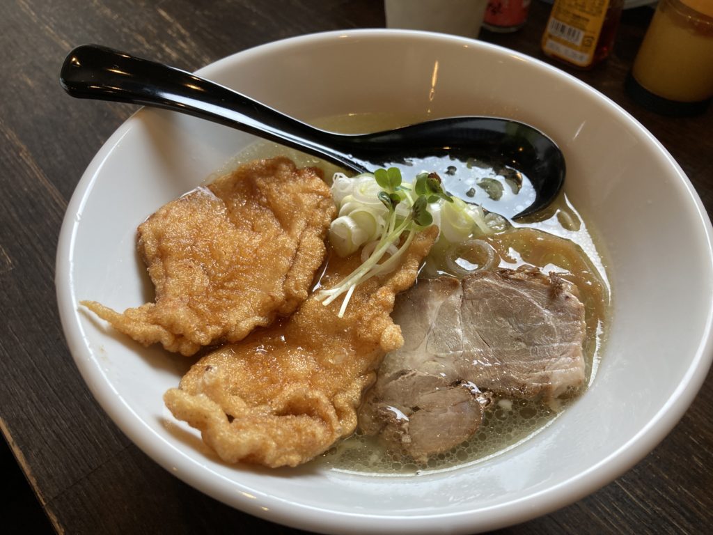 動物系に10種類の魚介素材で出汁をとったスープは透き通り、コクありあっさり系。洗練された味わいのスープです。麺は小麦の食感とテイストを存分に感じられる細麺。スライスの唐揚げとチャーシュー、かいわれ、ねぎ、レンコンがのっています。