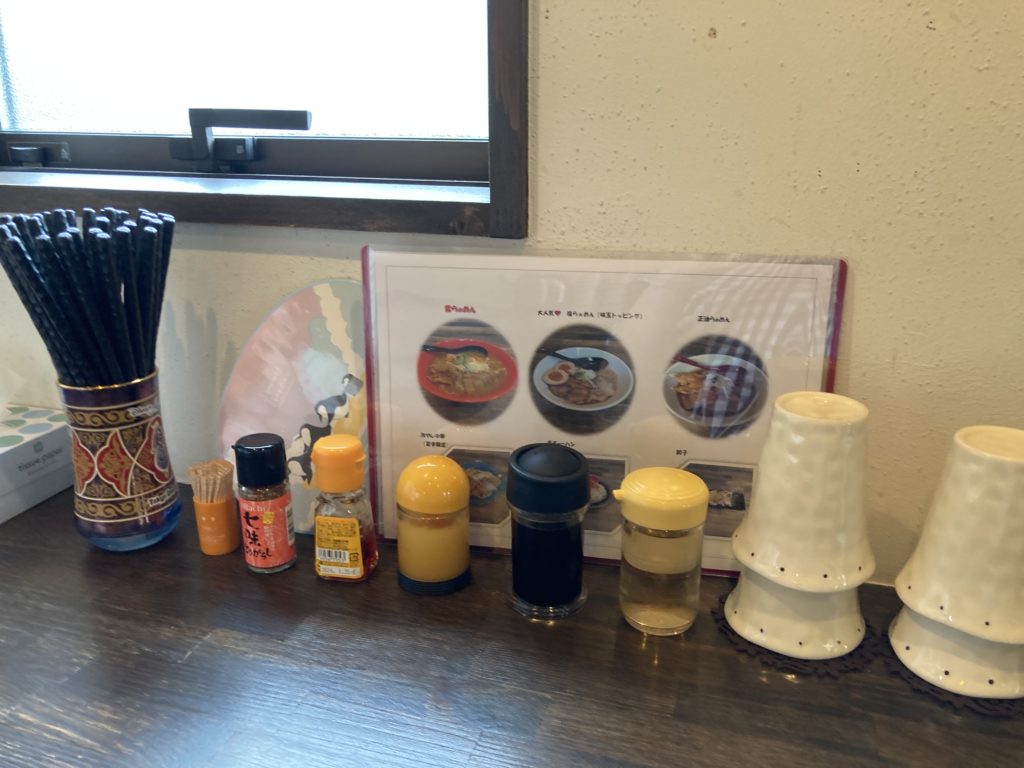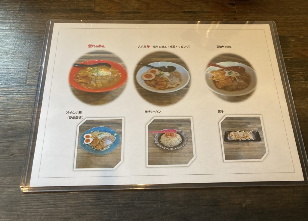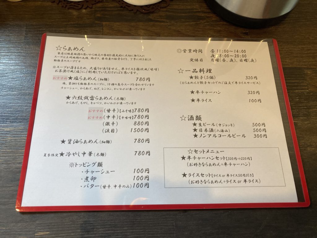 メニューには塩らぁめん、六紋銭雷らぁめん、醤油らぁめん、夏季限定冷やし中華の麺類と餃子、半チャーハンや半ライスそしてアルコール類もラインナップ。