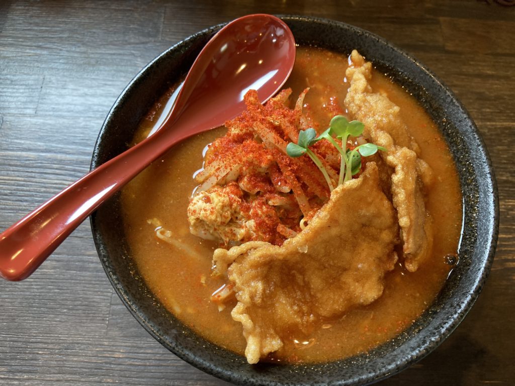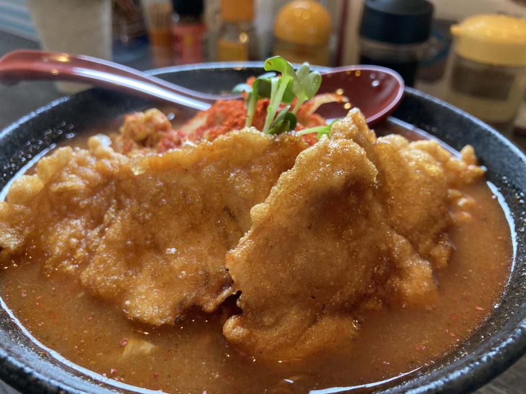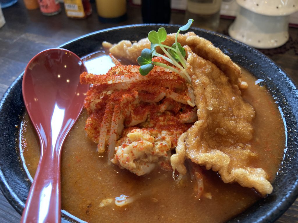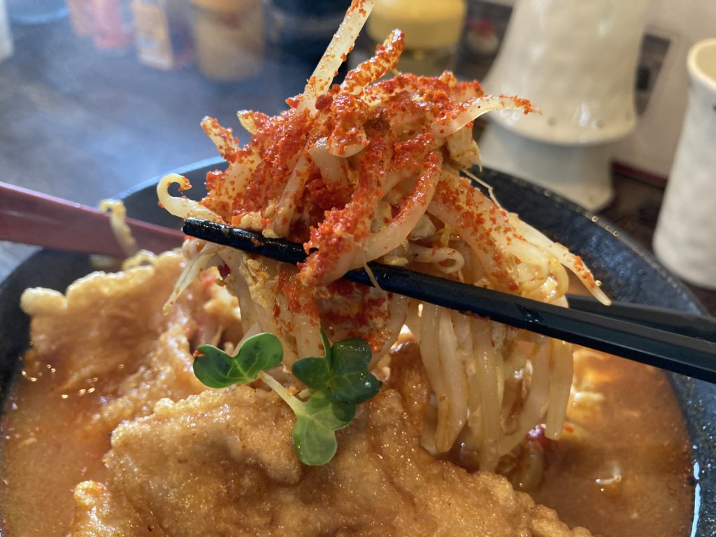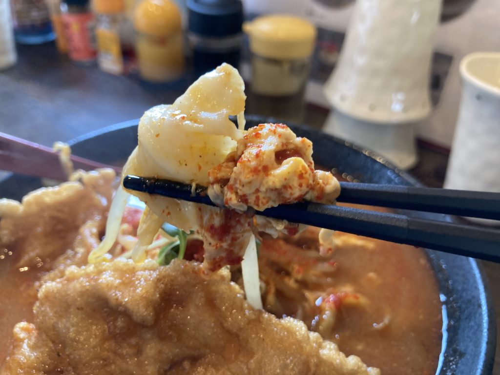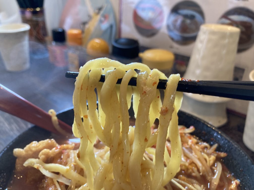 甘い味噌テイストのスープが辛さと相極まって美味しさを醸し出しますが、数回飲むと途中で口の周りが痛くなります。なかなかヤバめの激辛ラーメンですぞ。