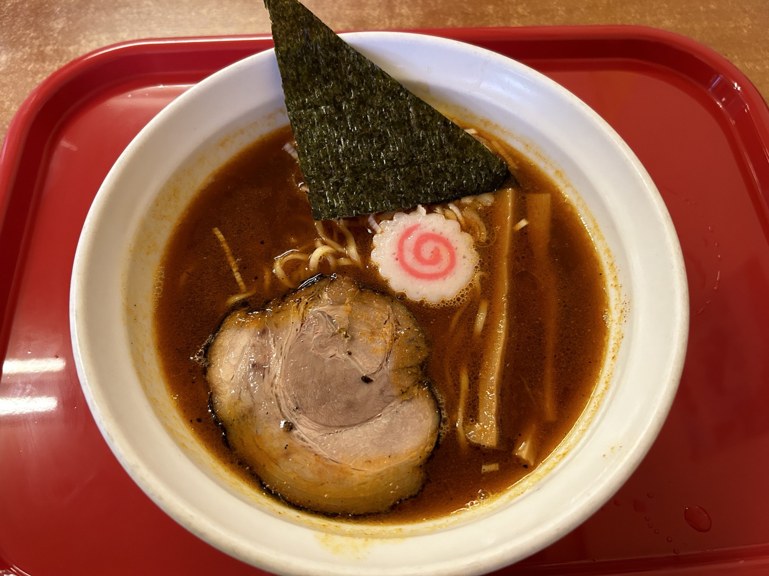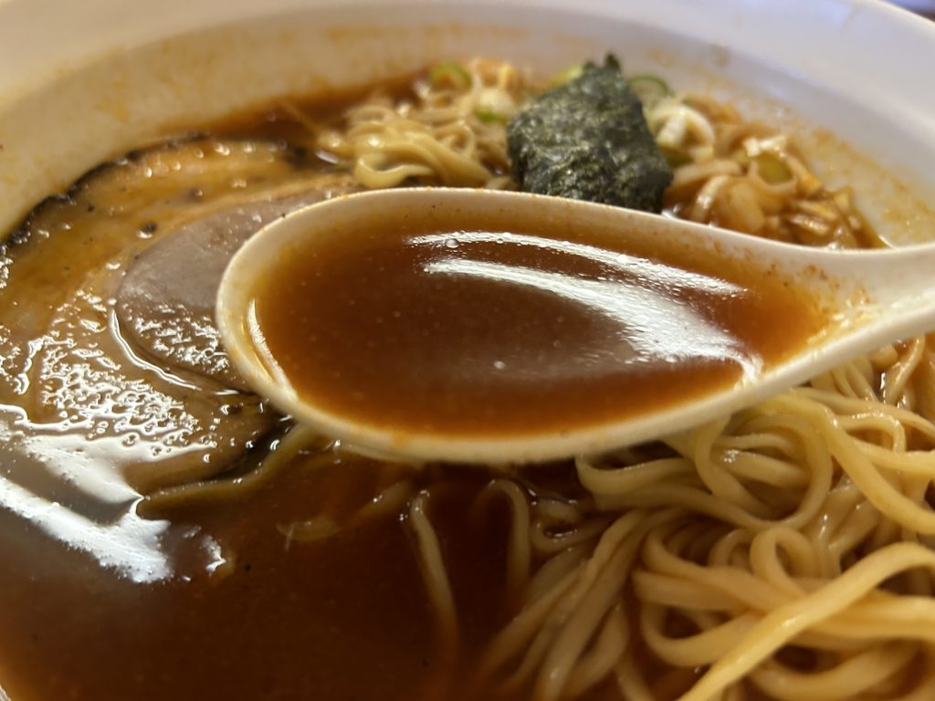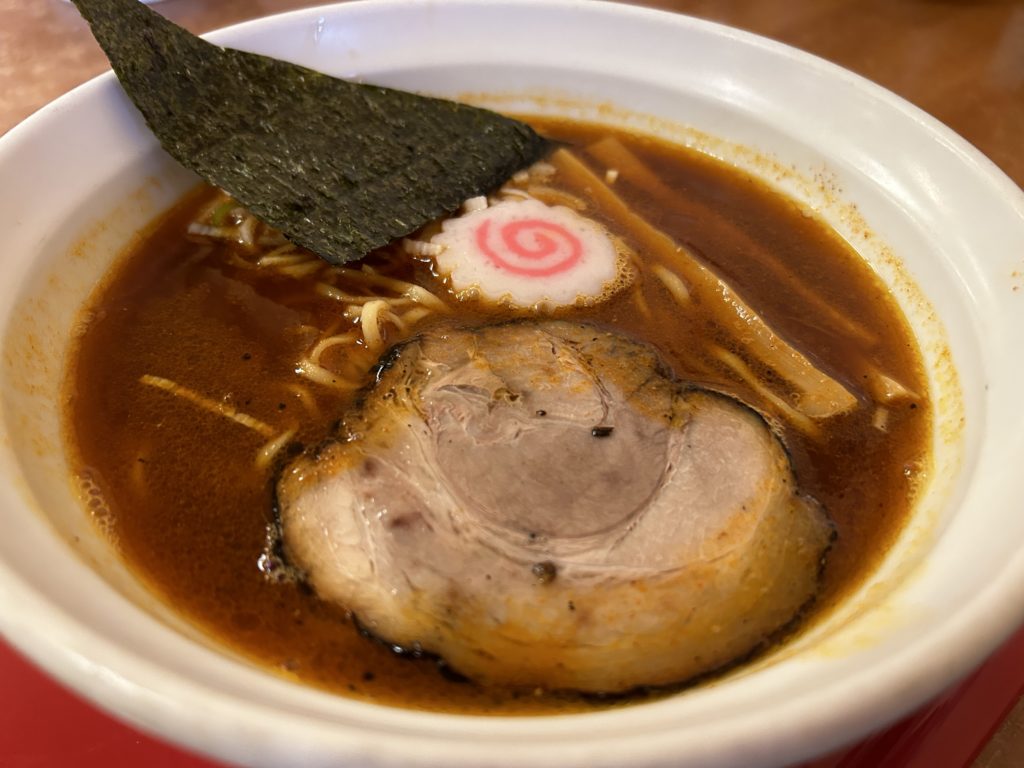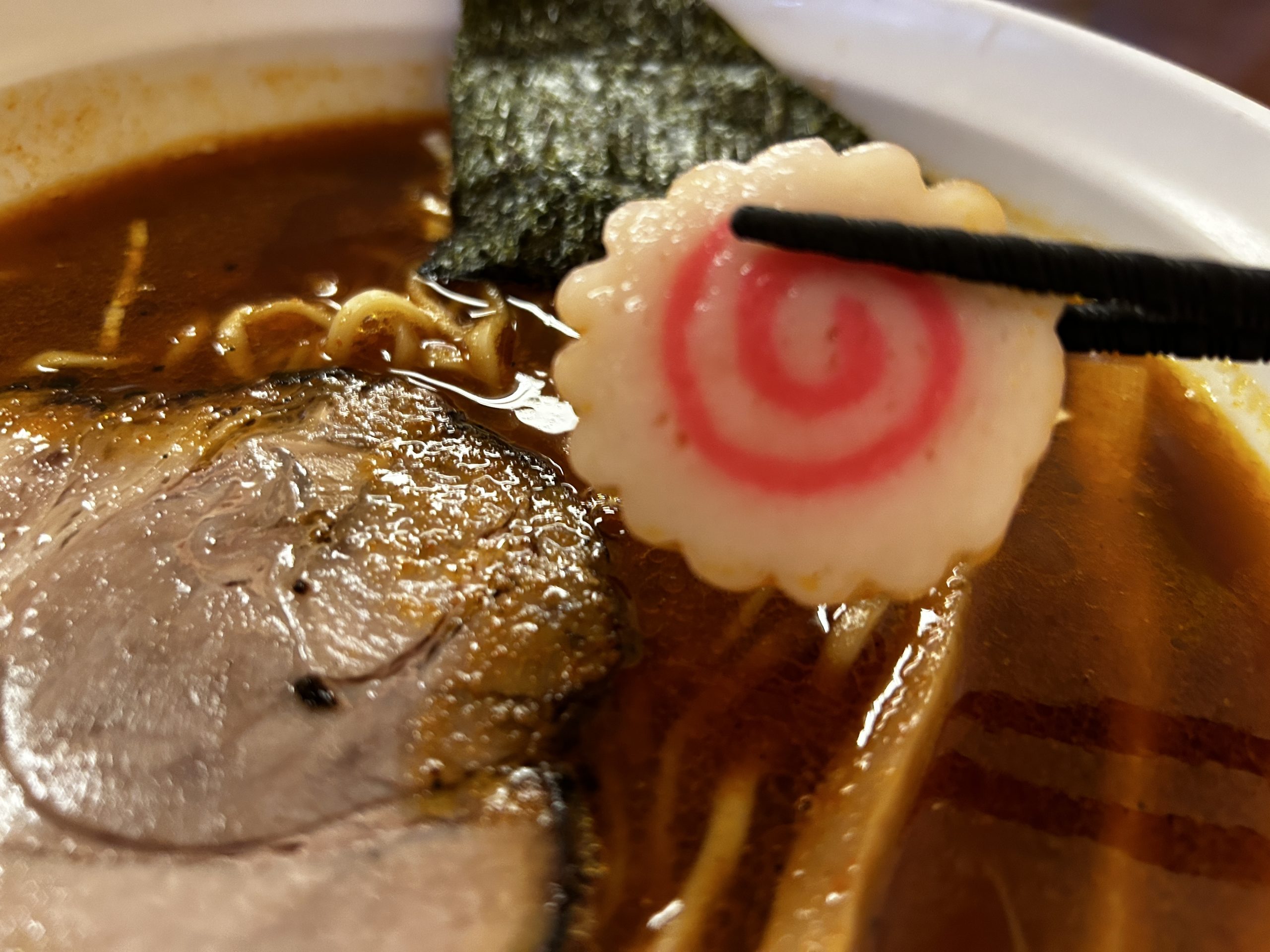 白醤油という存在感を激辛で覆い尽くした一杯。スープは辛味の茶色で支配されています。