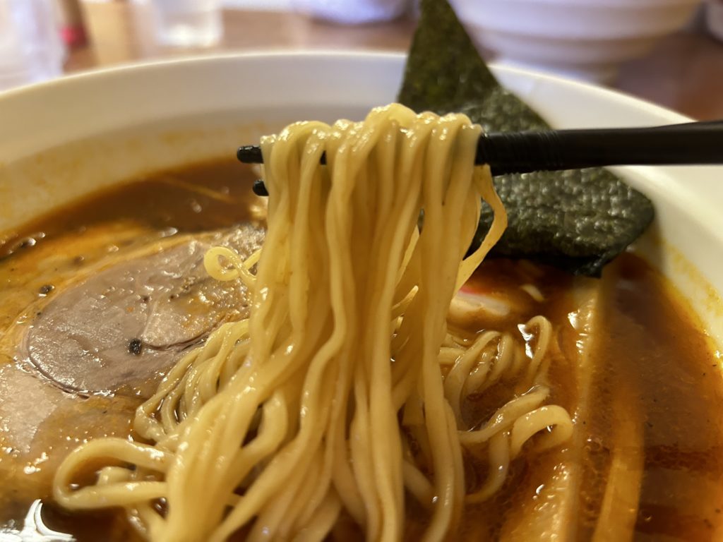 麺はストレートで中太、しっかりとスープが絡み喉越し抜群。