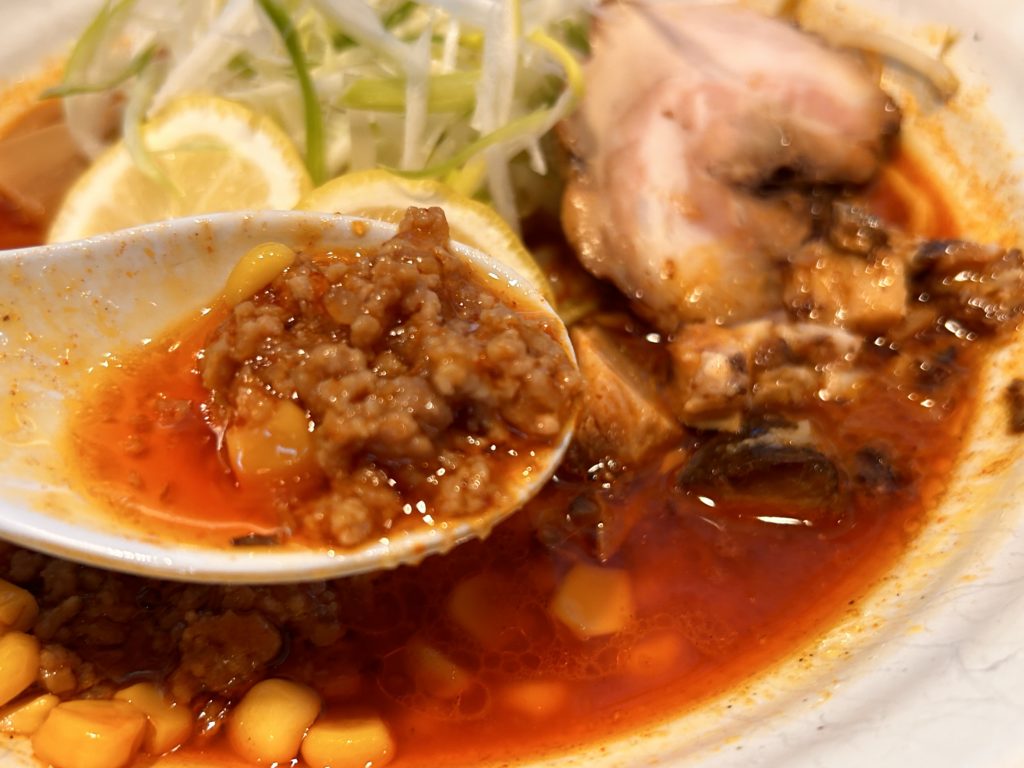 レモンが2つ、ひき肉味噌、刻みチャーシュー、チャーシュー、ネギ、チャーシューメンマが丼を覆い尽くします。
