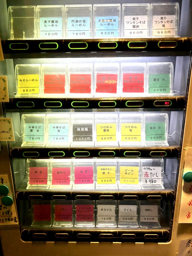 券売機には煮干醤油や塩、煮干ワンタンそば、みそ、辛みそ、中華そば、麻婆麺、つけ麺などなどバリエーション豊富。トッピングもやライス、肉めし、そしてビールにぴったりの手作り餃子もありますよ。