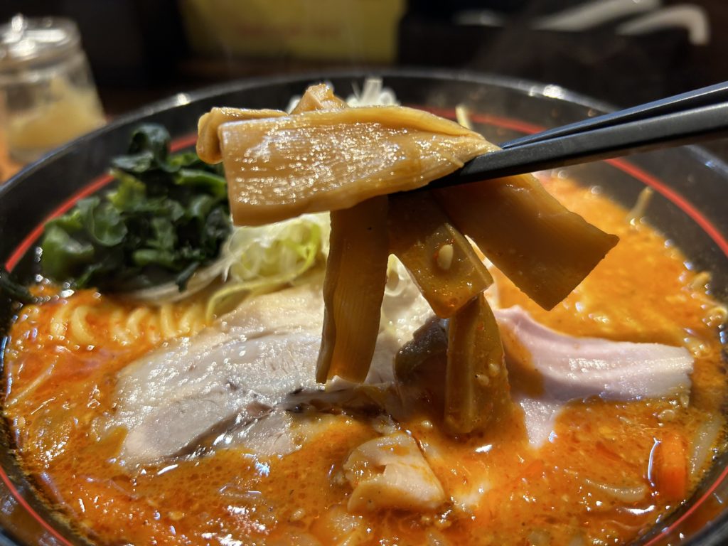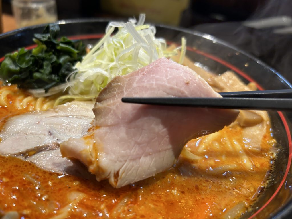 真っ赤なスープの中からチラリと顔を出す麺、その上にチャーシュー、わかめ、白髪ネギ、めんまがトッピングされています。