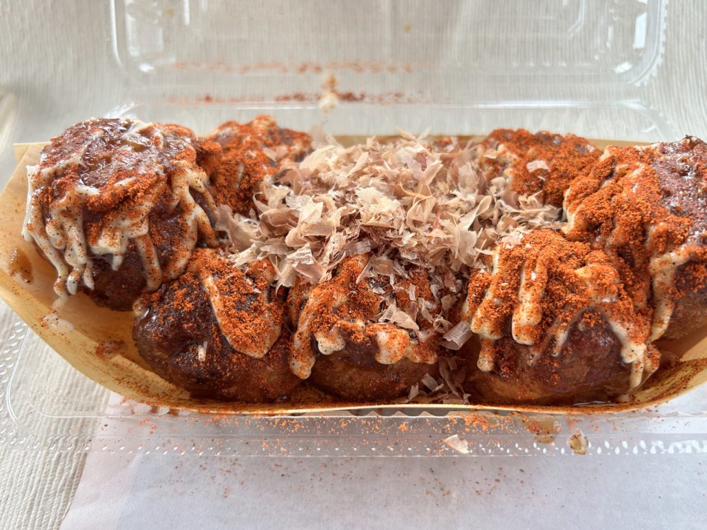たこ焼きの蓋を開けると、ふわーんとおいしそうなたこ焼きと一緒に辛味の香りが漂ってきます。細かい唐辛子ベースの粉は風味がとても良く、上品な味わい。
