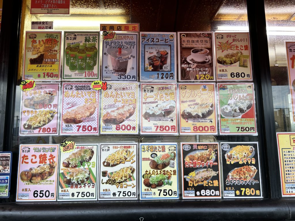 今回お邪魔したたこ顔は富岡市のセキチュー敷地内にある富岡店。夕方近くでしたが、客足が途絶えることの無い人気店です。バリエーション豊富なたこ焼きが並びます。