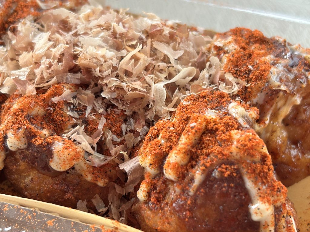アツアツこんがりなたこ焼きの上にしょうが、鰹節、ソース・マヨネーズそして、激辛と思しき赤くて細やかなパウダーがたっぷりかけられています。