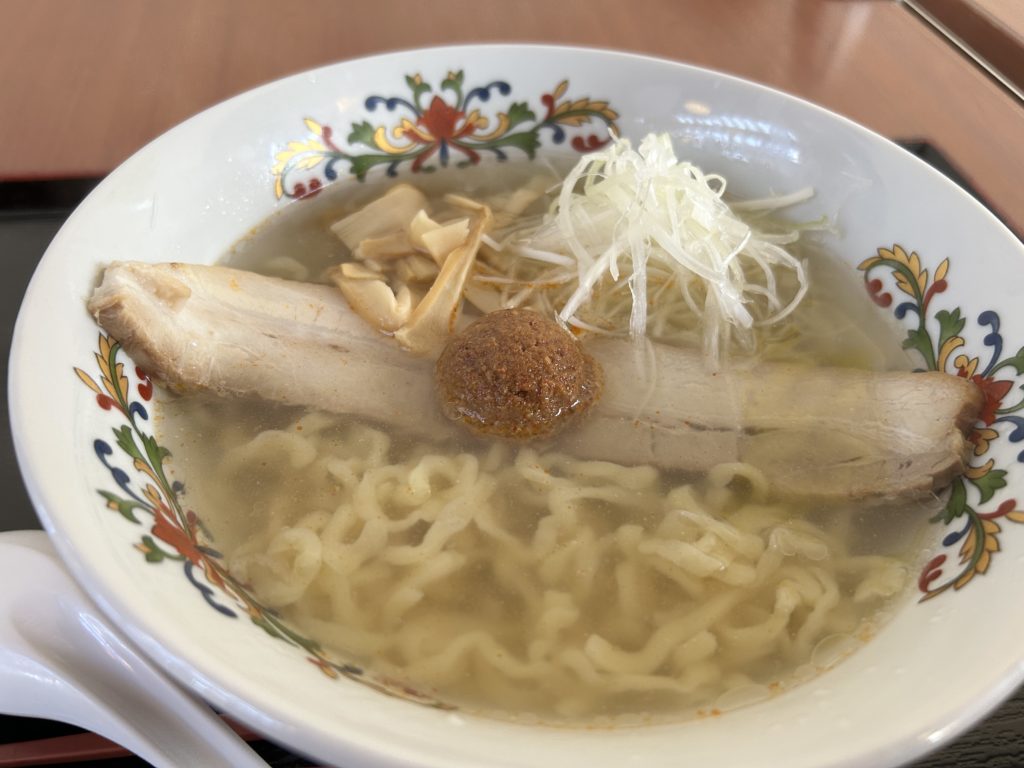 数分後やってきた赤魂。クリアなスープの中に平打ち手揉み麺、チャーシューと辛味噌、そしてめんまに白髪ネギがのっているインパクトのあるラーメンです。