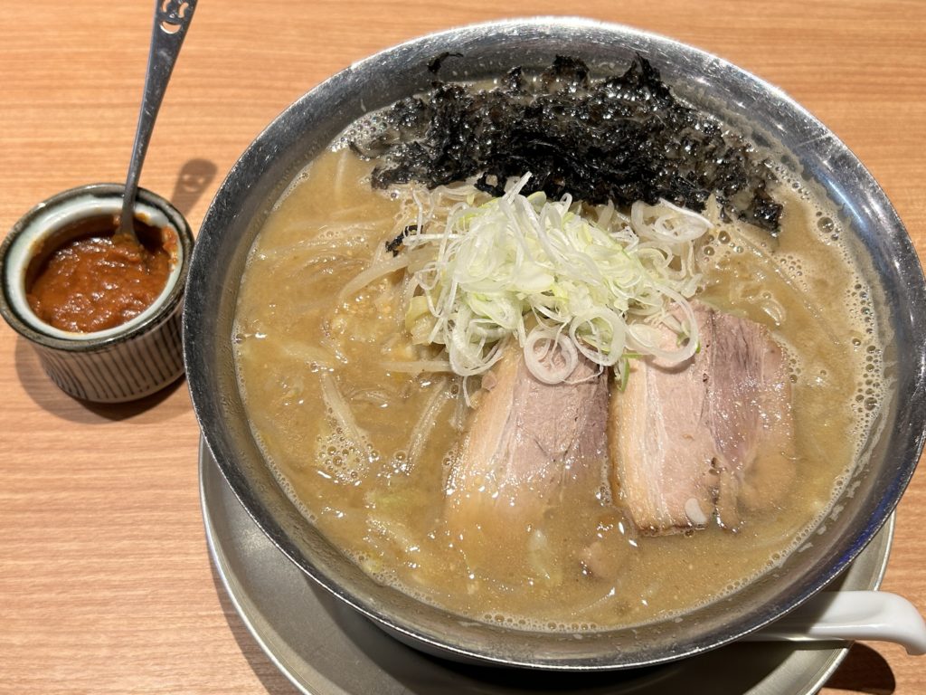 背脂と味噌で悩んだのですが、味噌ラーメンをオーダーしました。驚いたのは鉄製の器に入って登場しました、さすが燕市。そして辛味噌がついてきたことに驚きです。