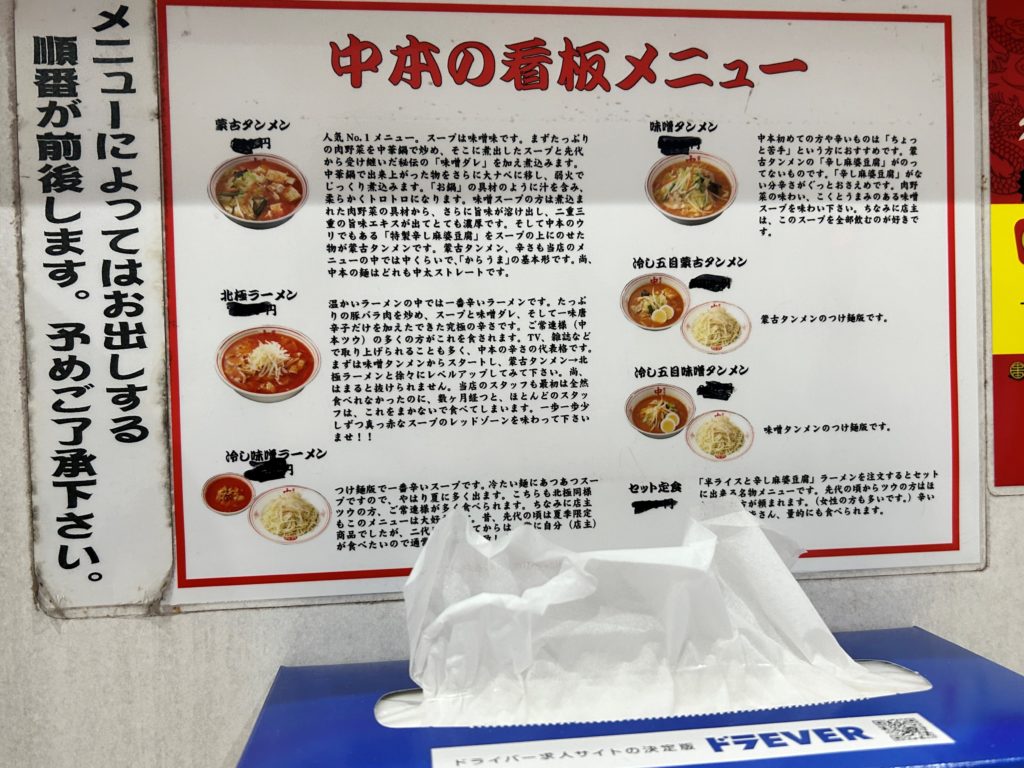 定番の蒙古タンメンや辛い北極ラーメン、シンプルな味噌タンメンなどファンにはたまらないメニューが充実しています。また冷し五目蒙古タンメンや味噌タンメンなどのつけ麺もあります。