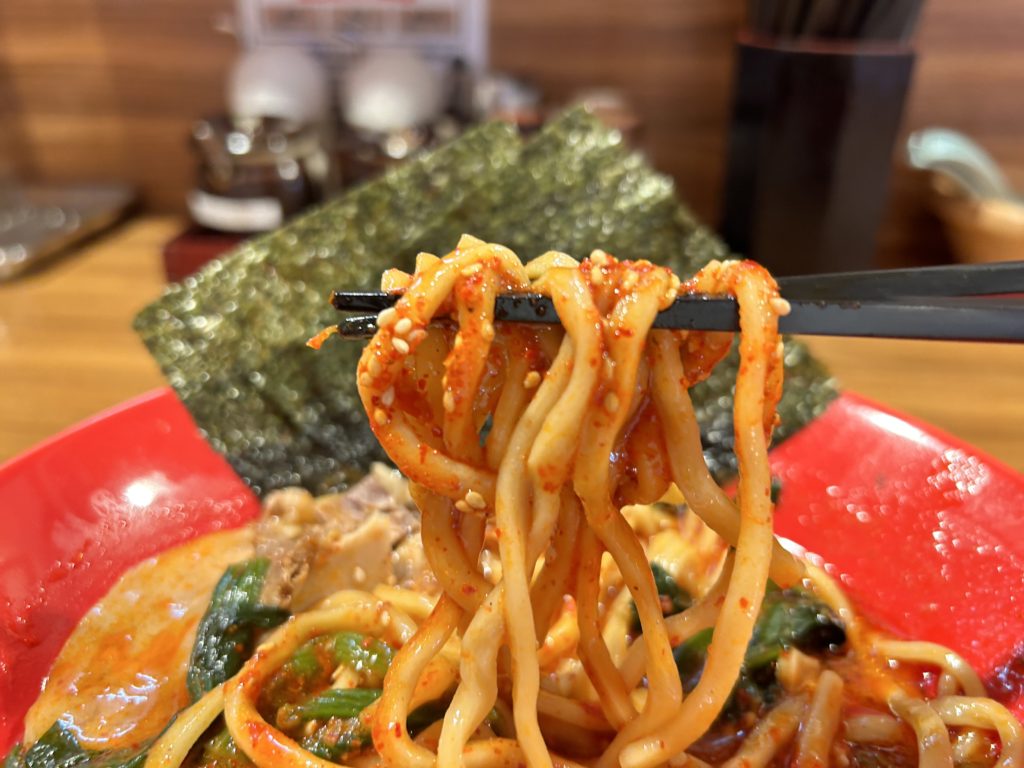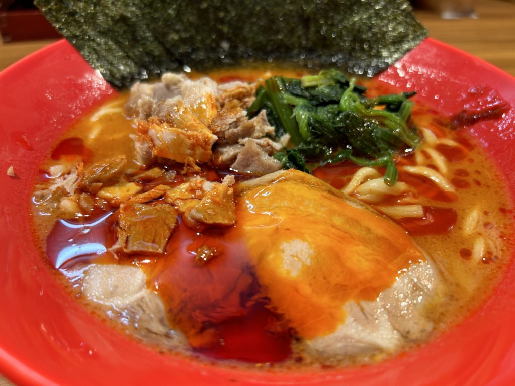 旨辛で唐辛子の風味を感じます。チャレンジなどをされる激辛マニアには刺激少な目かもしれませんが、程よい辛さが食欲をそそります。具材にしっかりスープの味が絡み、家系と辛さが絶妙に融合!