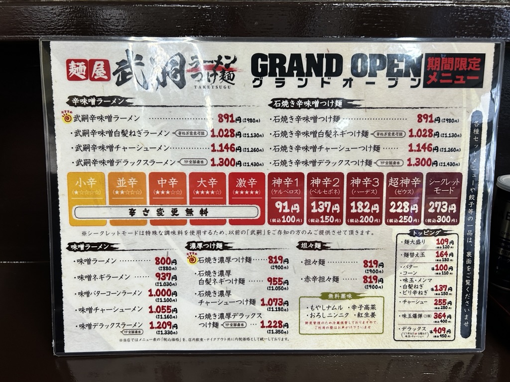 激辛は辛さ増し無料の小辛から激辛、有料の神辛1からシークレットモードの5段階がありますが、マックスシークレットは、武嗣の辛さを知る人のみオーダーできるのだそう。