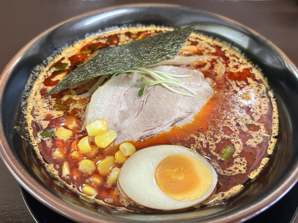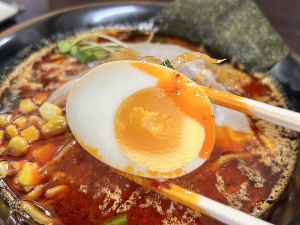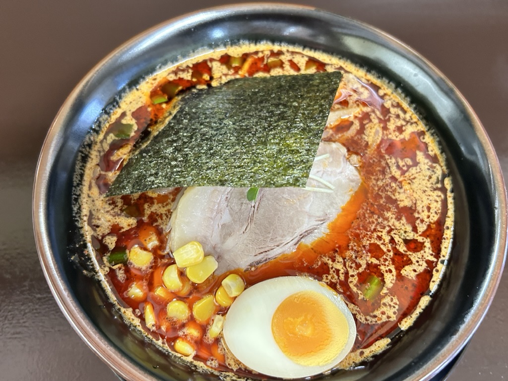 ということで今回は、シークレットの手前のゼウスをお願いしました。数分で登場したのがこちら。見てすぐにわかる武前のラーメン。黒い丼に海苔、チャーシュー、ゆで玉子、メンマそしてコーンがトッピングされています。そして味噌スープの上には真っ赤な油が幕を張っていて辛さを表現しています。