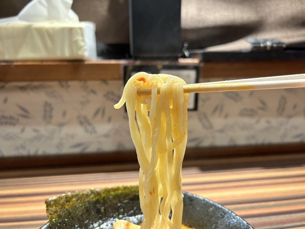 麺は中太平打ちですが、どこか稲庭うどんを彷彿させるような食感とビジュアル、ツルツル喉越し抜群。
