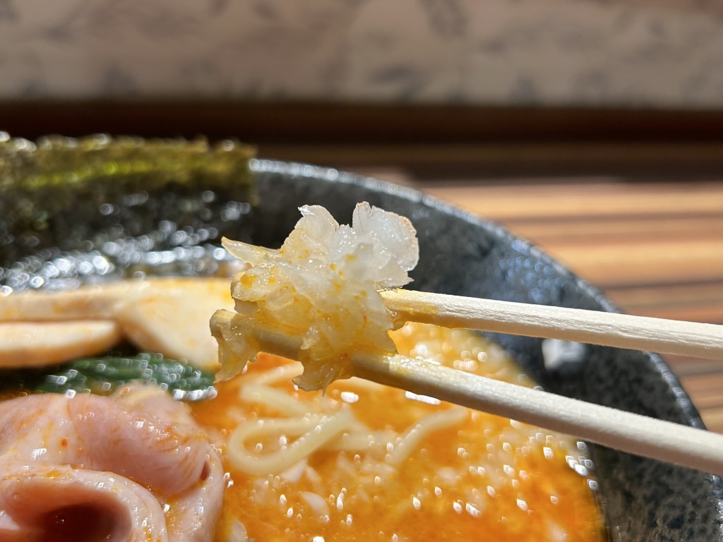 豚白湯、今まであまり出会ったことのないスープですが一口啜ると、コクがありまろやかでしつこさなどは一切なく、スッと染み込んでいきます。美味しい!