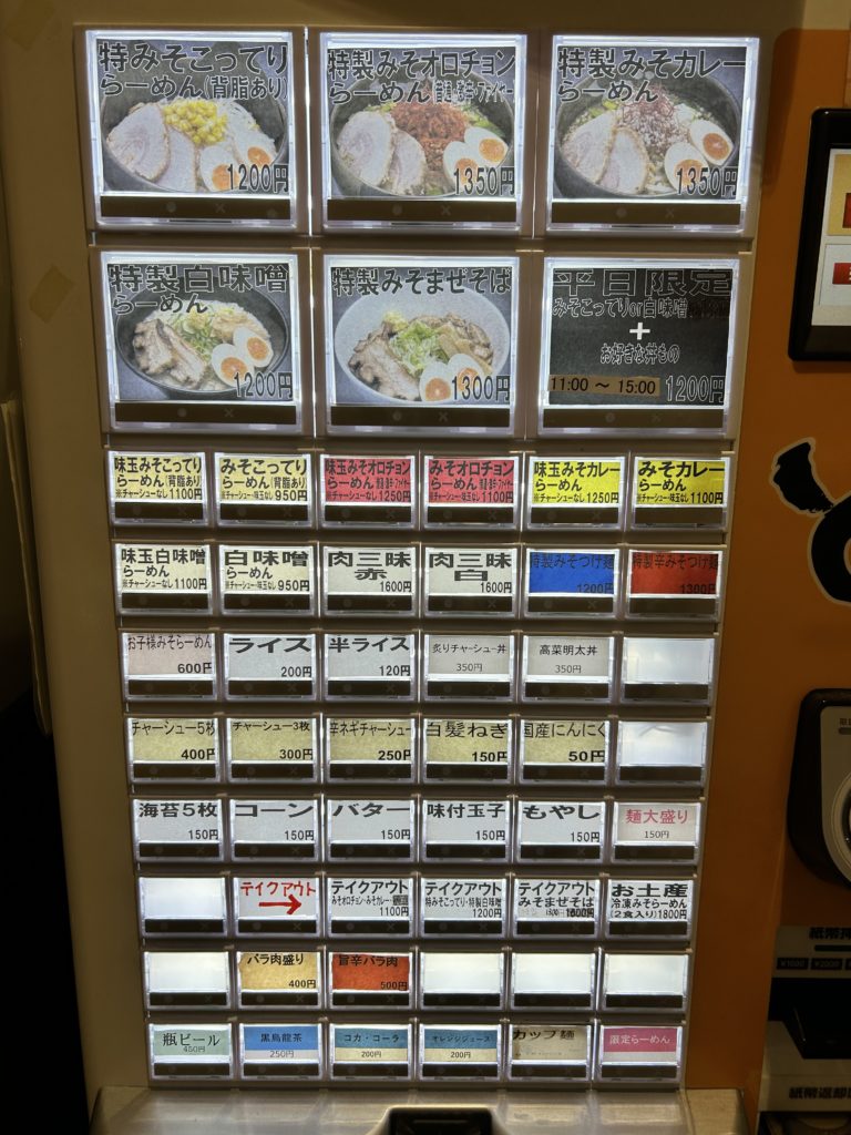 お店の入り口にある券売機でメニューを決めます。みそらーめんやみそまぜそば、みそカレーらーめんなどをはじめ白味噌らーめんと味噌のバリエーションが豊富。
