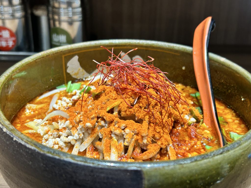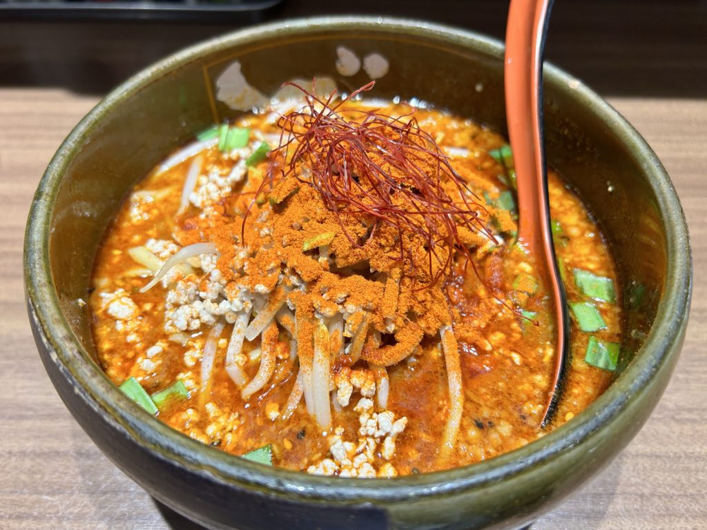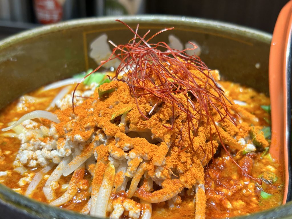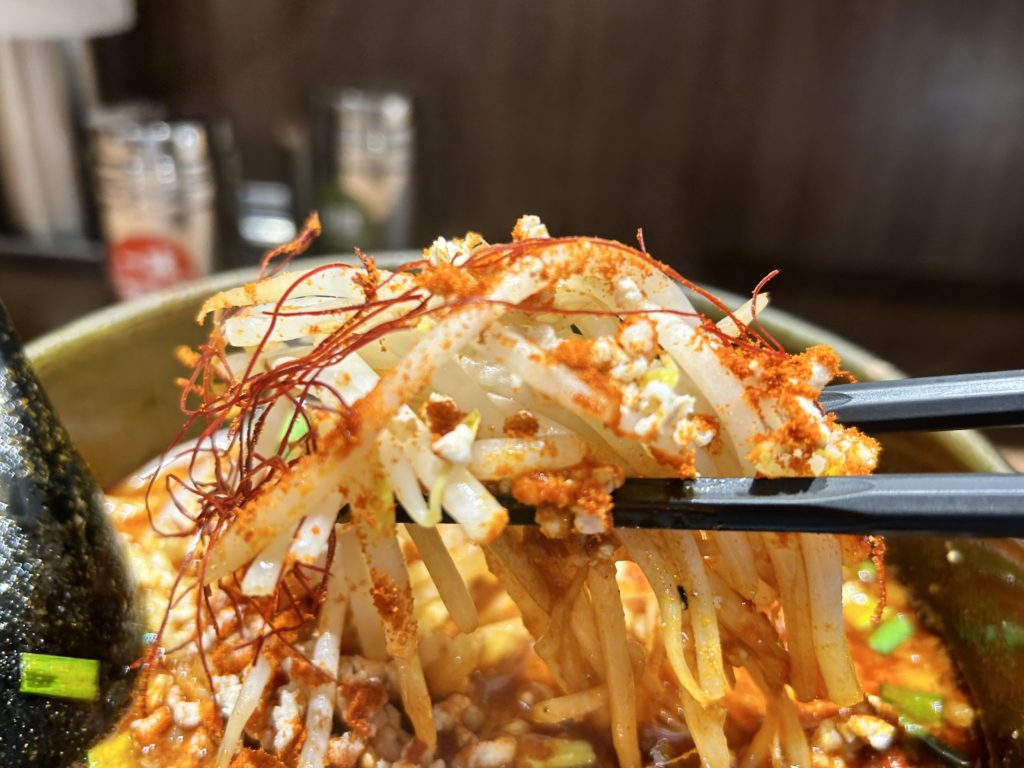 頂上には真っ赤な辛味がたっぷり乗っています、おそらくカイエンペッパー?具材は糸唐辛子、もやし、ねぎ、そして鶏ひき肉。