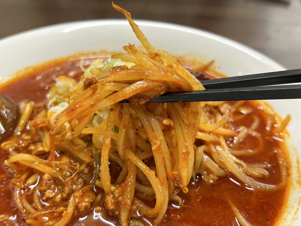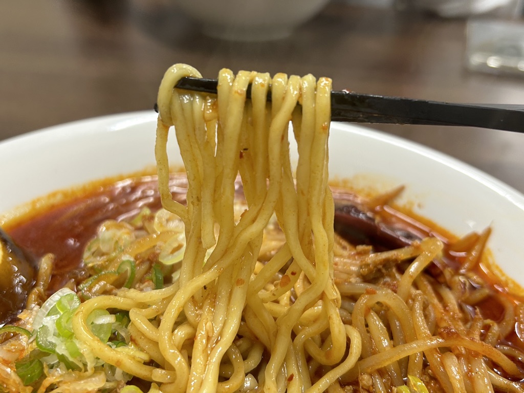 中太ストレート麺にスープが絡み、絶妙な美味しさ。炒め野菜の香ばしさがスープにも溢れ出ています。