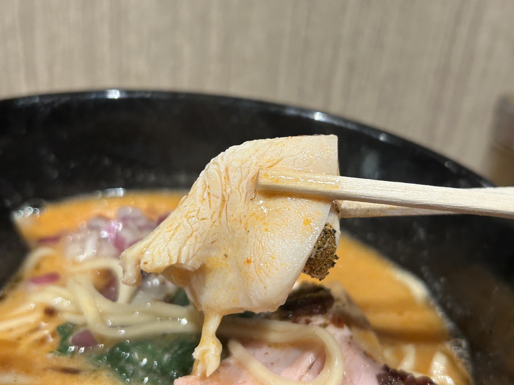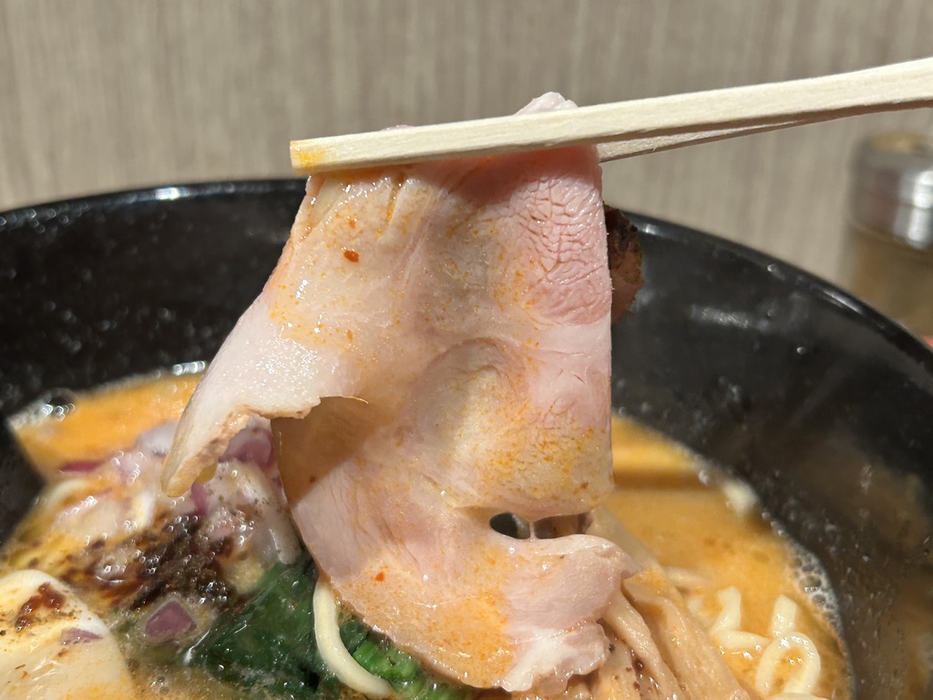 豚肩ロースと鶏むねと2種類のチャーシュー、メンマ、玉ねぎのみじん切りがトッピングされています。真空低音で調理された豚肩ロースのチャーシューは箸で持つと崩れてしまいそうなほど柔らかく、鶏むねチャーシューは歯ごたえ抜群。