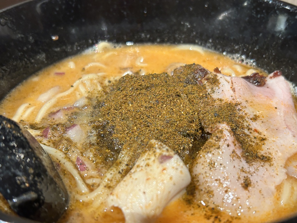 スパイシーな赤はほんのり辛さを感じますが、卓上に黒炒り七味があったのでかけてみました。