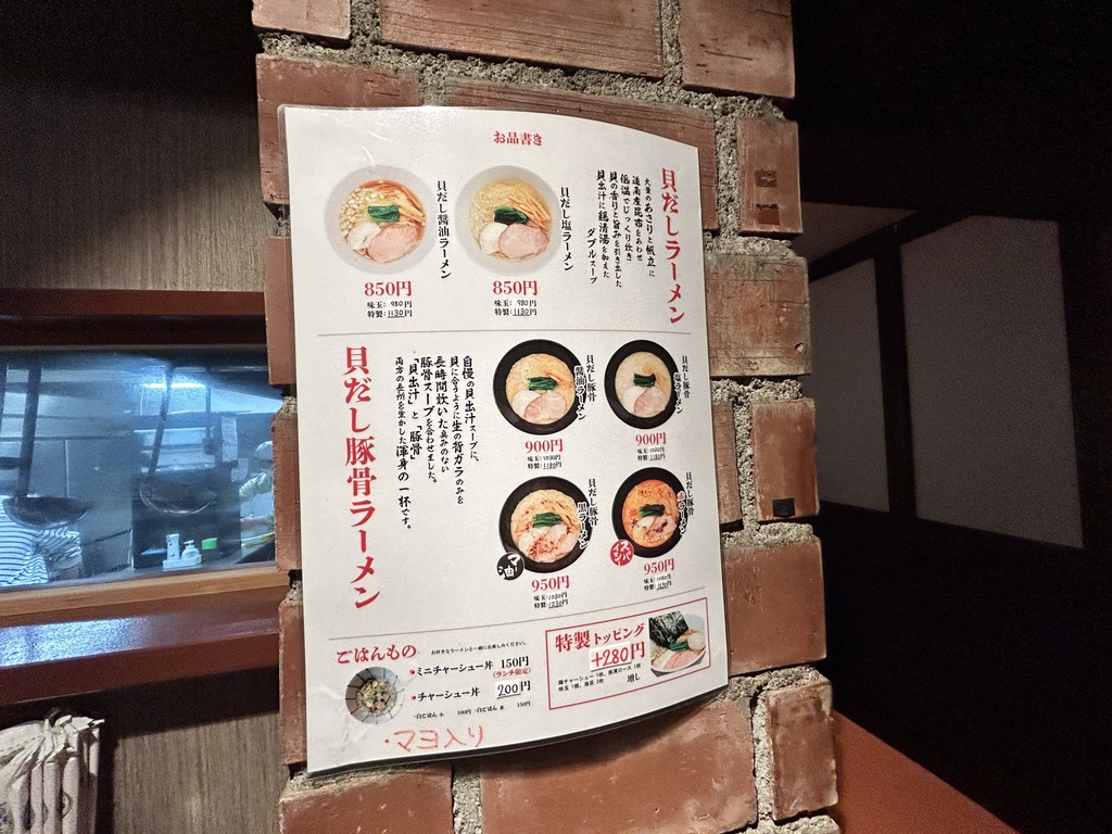 貝だしラーメンは塩と醤油の2種類あります。また貝だし豚骨ラーメンは塩と醤油さらに黒と赤がが選べます。