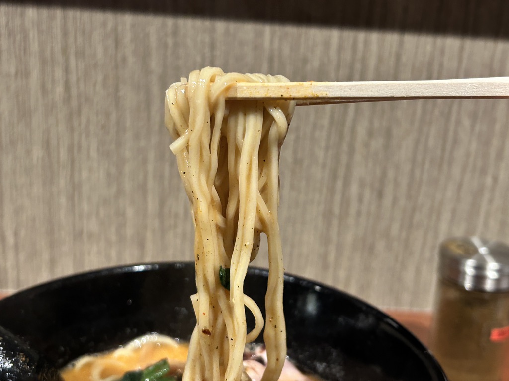 ストレートの中太麺にスープが絡み、絶妙なおいしさを奏でます。