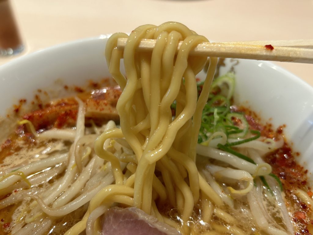 中太ストレートに近い麺にガッツリスープが絡み、小麦とスープが美味しさのハーモニーを奏でます。