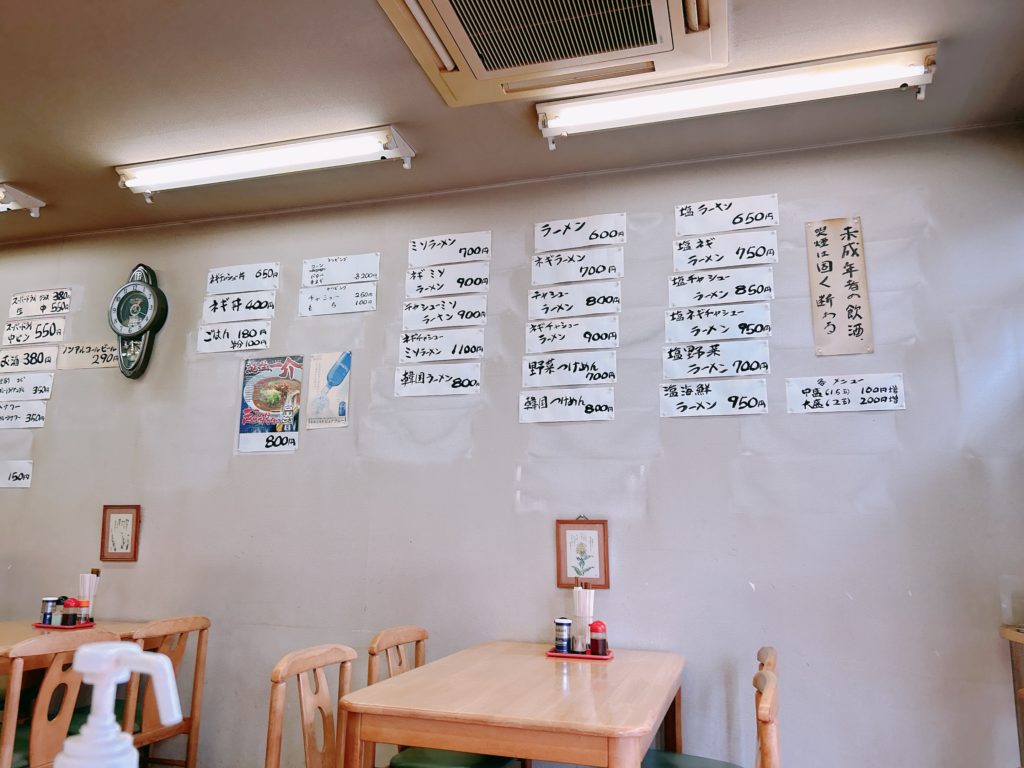 メニューがこちら、テーブル席の横にある壁に貼ってあります。
