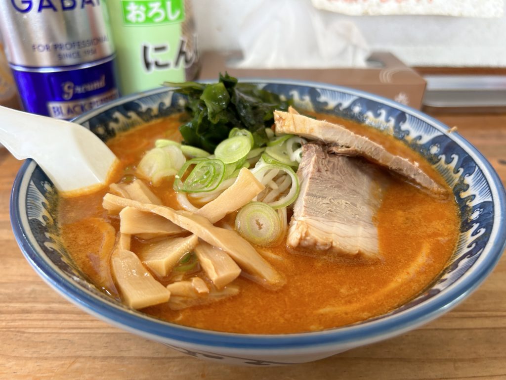 激辛みそラーメンの着丼です。メンマ、ネギ、チャーシュー、わかめがのっています。