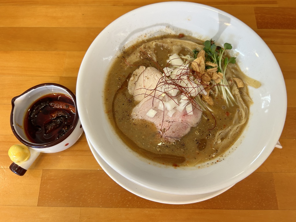濃厚なスープは優しい味わいで、香ばしくてピリ辛のラー油を混ぜても味が壊れません。