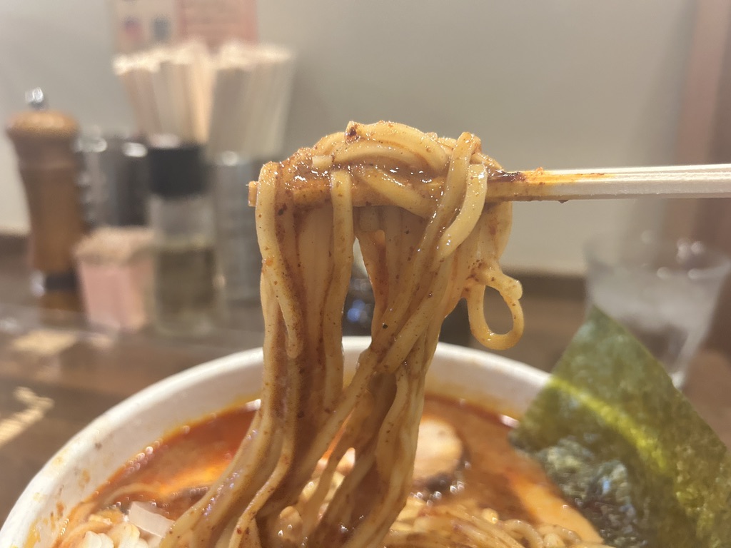 麺は中太ストレート、食べやすい食感なのとスープがめちゃめちゃ絡む設計、計算し尽くされています。