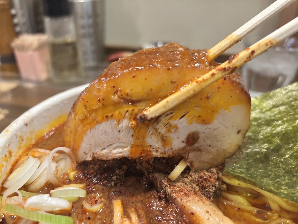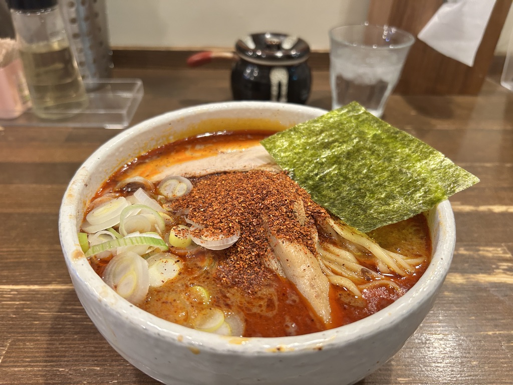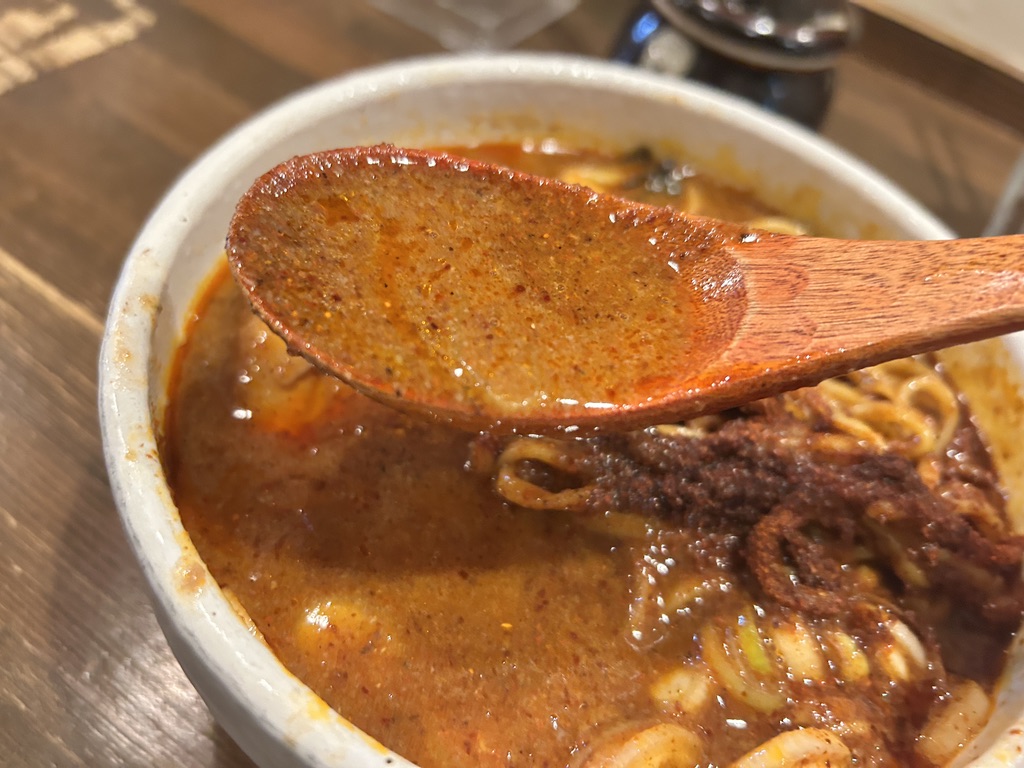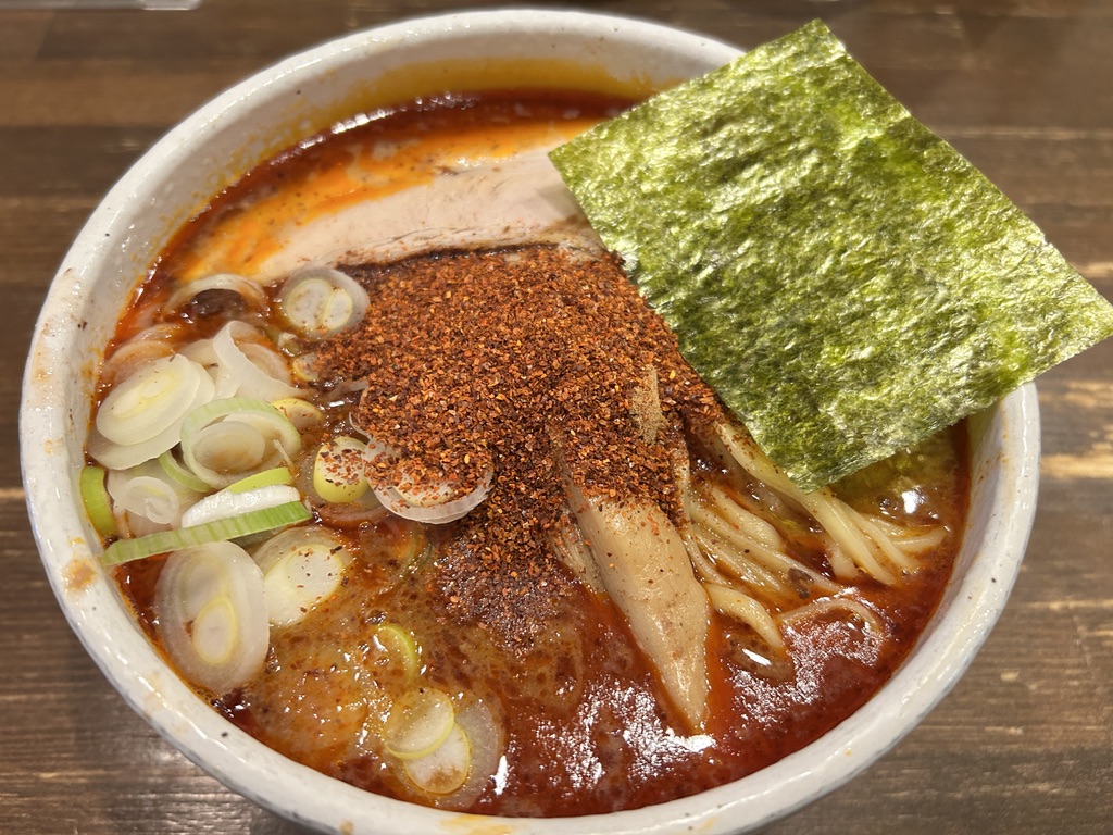 豚と鶏が抽出されたコクのあるスープに、魚粉と唐辛子の辛味が融合し、至極の美味しさを奏でます。魚粉自体に辛さだけでなく魚の旨みが凝縮されていて美味しいんですね、はい。
