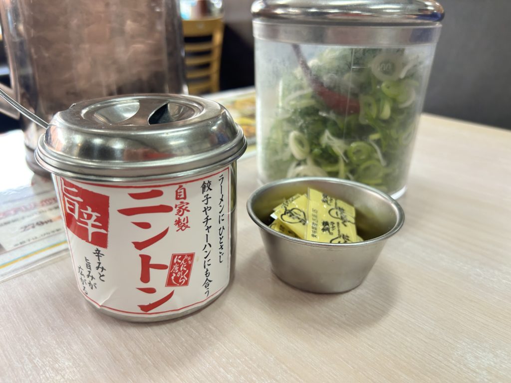 卓上にはかけ放題のネギとニンニク、唐辛子ニンニクがあり、好みのテイストにカスタマイズしてラーメンを食べられる嬉しいサービスもあります。
