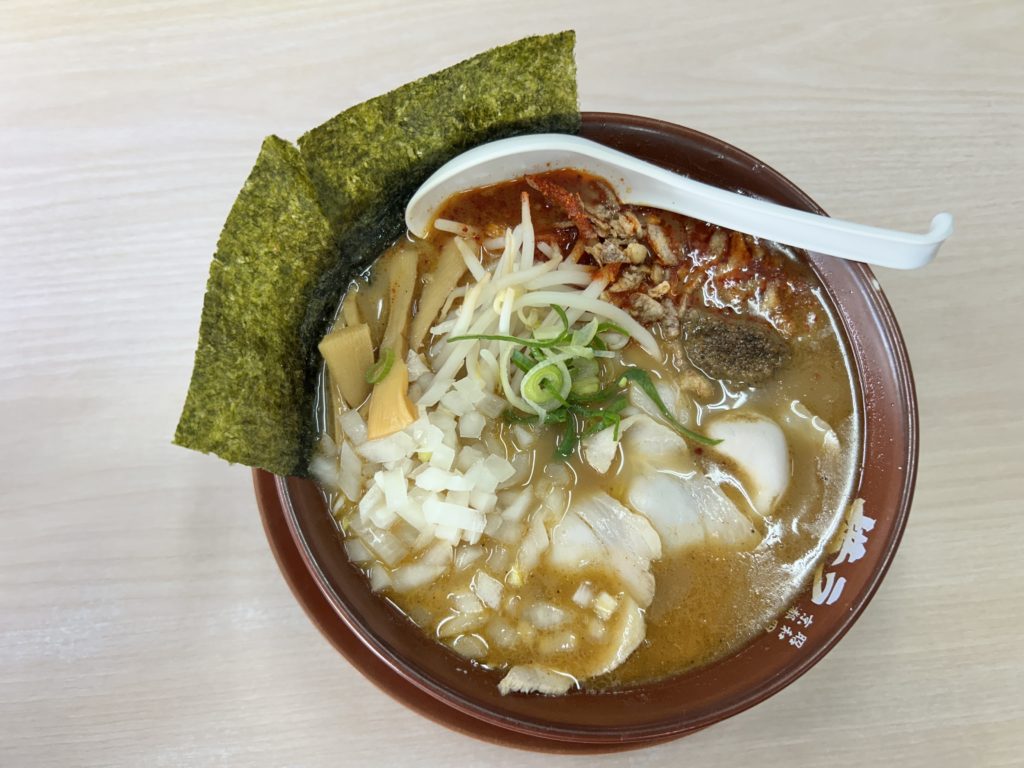2種類のラーメンをオーダーし、ほどなくして着丼です。まずは赤ダレラーメンから。ちなみに50円プラスで赤ダレを増してもらいました。ネギ、チャーシュー、揚げ玉ねぎのみじん切りがトッピングされています。