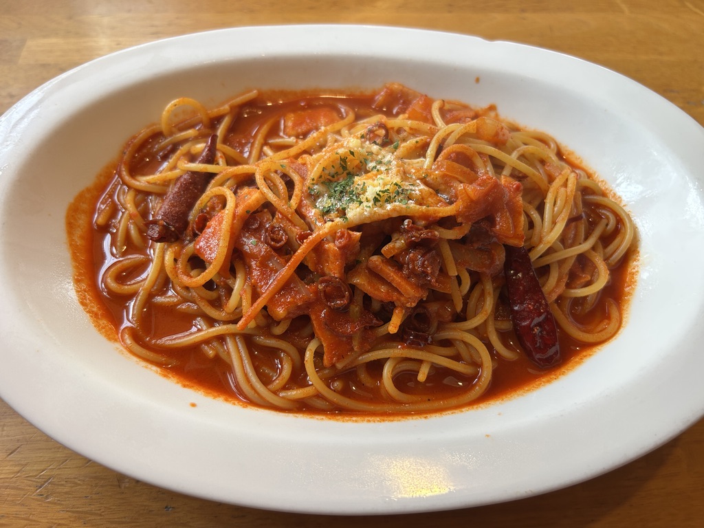 中太のパスタに激辛トマトソースが絡みつき唇の感覚を奪っていきます。久しぶりにこのレベルの辛さを体感しました。