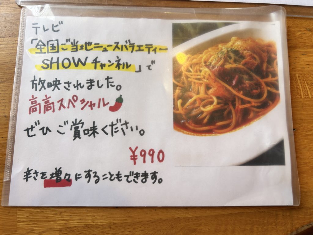 テレビでも放映された、高高スペシャルです。名門高崎高等学校にちなんでネーミングした激辛パスタです。