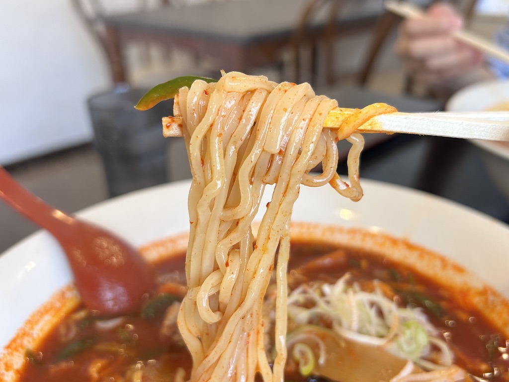 麺は透明感とコシがある細麺は少々の縮れており、ここにスープが絡んで、旨みと辛味が口の中に溢れます。