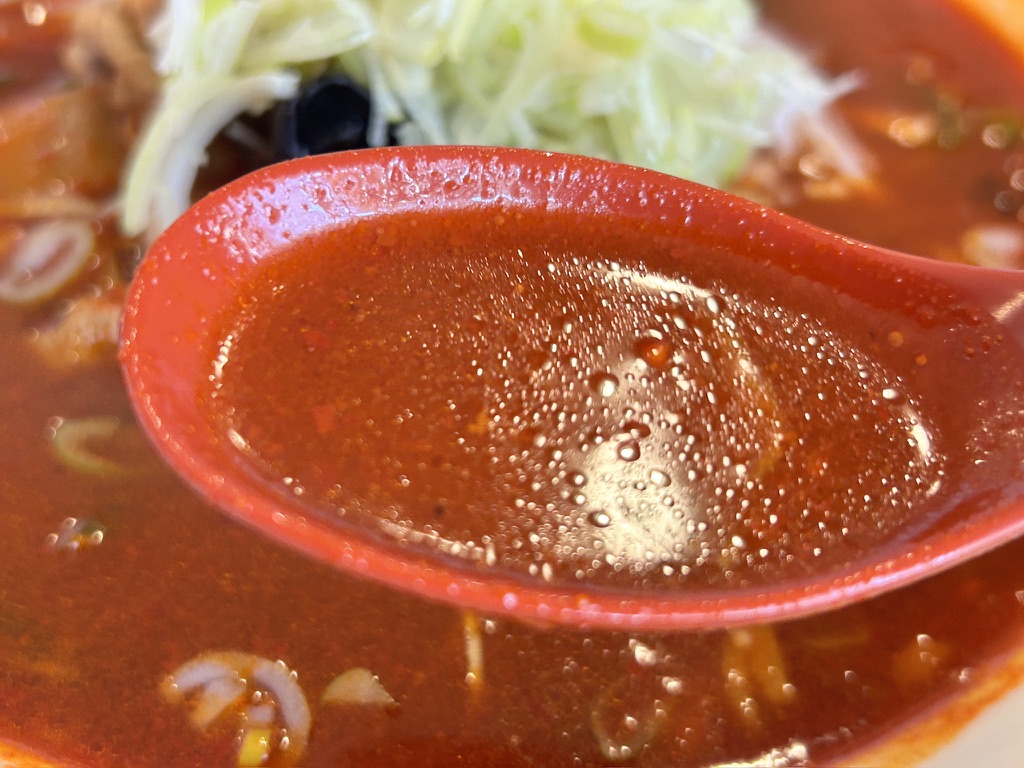 2種類のオロチョンが着丼しました。まずはオロチョンラーメン9倍(トリプル)です。この記事を読んでくださる皆さんの心をくすぐる赤さではないでしょうか?!