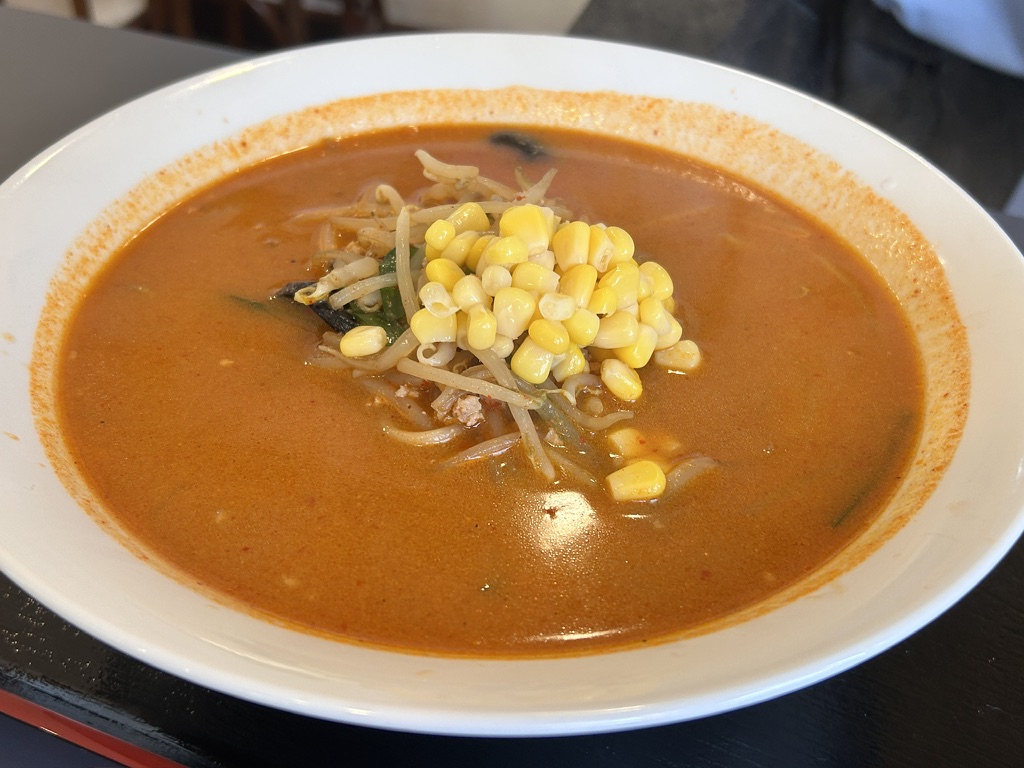 コーンのトッピングが、北海道系ラーメンを彷彿させます。濃厚なのにスープがさらりとしていてこちらも染み込む系。炒めた野菜が香ばしさを奏でます。辛さは2倍の極でしたので、ピリ辛でいただきました。