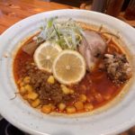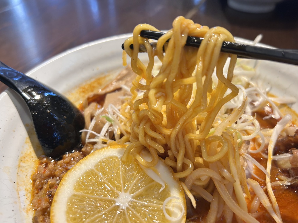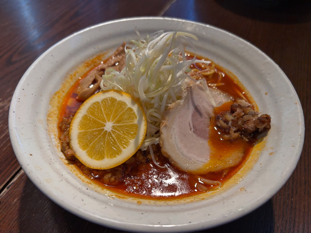 味噌味で超激辛の火山らーめんの着丼です。レモンとチャーシュー、白髪ねぎ曽っしてメンマがトッピングされています。
