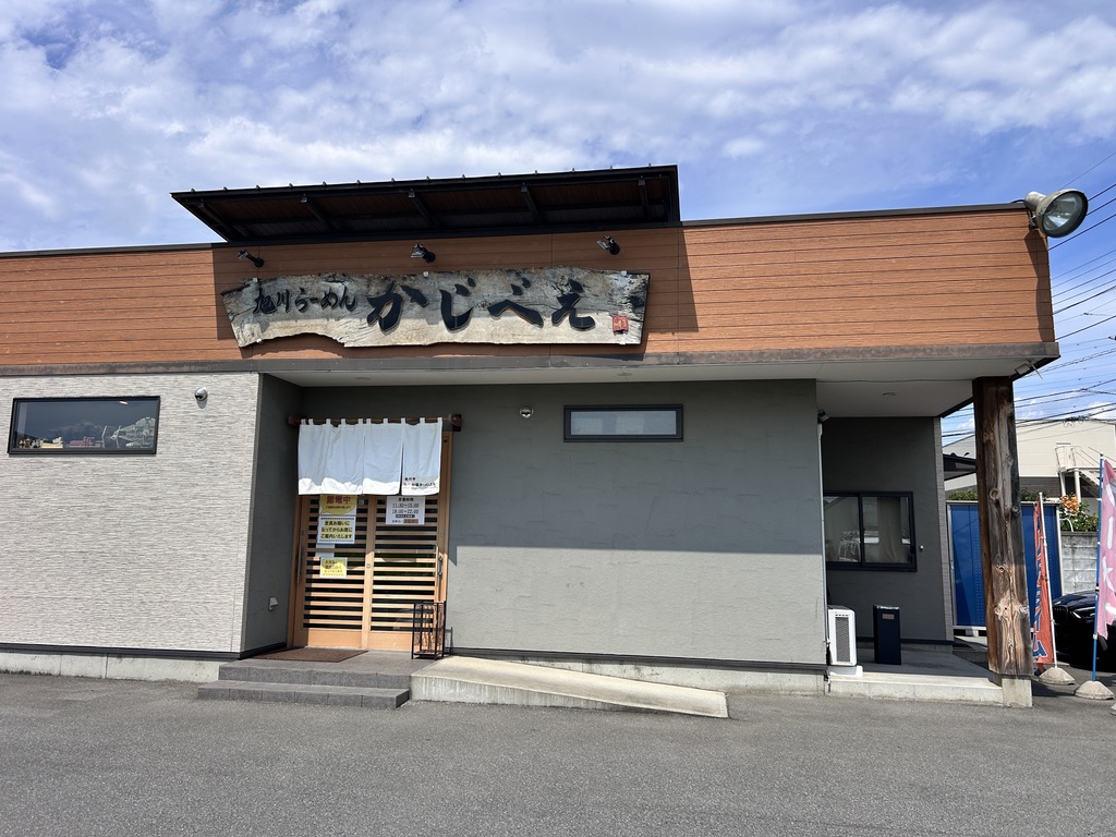 前橋市西片貝町にある、旭川らーめんかじべえの店構えがこちら。前橋市を走る県道3号や上毛電鉄片貝駅から程近い場所に位置します。